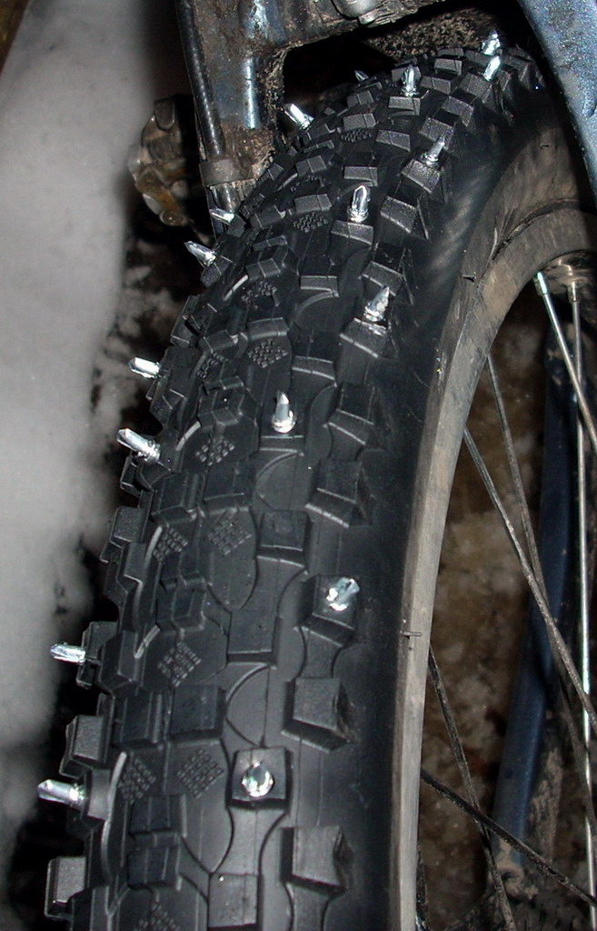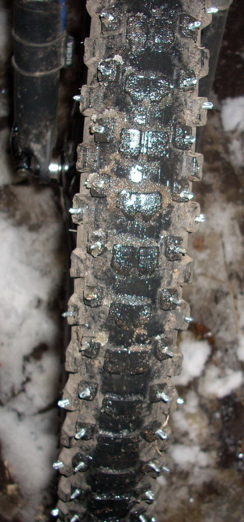 Поиздевался над покрышками Кенда Клайв к876 похожим образом, только саморезы брал не под сверло, а острые. И немного обгрыз их кусачками. 176 в переднем в 4 ряда, а в заднем только 88 в 2. Вчера пробовал погонять немного, вроде неплохо.