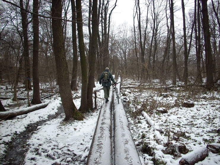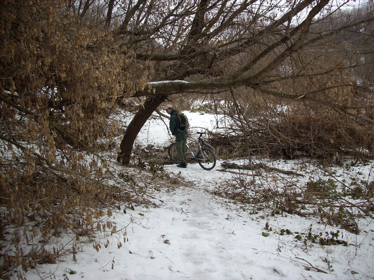 За сегодняшнюю субботу освоены 50 км. И если кого-то вводил в заблуждение повсеместный вид чистого асфальта в городе, то на нашем маршруте такого асфальта была самая малость. Все грунтовки за предыдущие дни оттепели укатались машинами и схватились морозом, с образованием ледяных желобов. Хуже дороги не придумать. Встретившись у проходной Рифа, мы вдоль ж.д. доехали до моста через ВОНЮЧКУ! ГОЛУБОЙ! ДУНАЙ! а потом вдоль этой достославной реки до места впадения ее в Дон. И все по желобам или обледенелым тропинкам. Моей шиповки явно не хватало, поэтому я, когда было возможно, съезжал на снег, к счастью неглубокий, в то время как 460 продолжал покорять ледяные желоба . Пару раз на этих желобах убрался и он, оставив на льду дугообразные следы расчесов от шипов. Добравшись вдоль Дона до курского моста, мы решили ехать и дальше вдоль реки и вскоре очутились в чащобе непролазной. Зато там льда не было. Зато пришлось форсировать сначала один, потом второй , а потом и третий ручьи, весело несущие свои воды в Дон. После третьего ручья начались дачи и мы решили себя побаловать чистым асфальтом до Тепличного. Проехав по нему около километра, свернули опять к Дону к ненасытным ледяным желобам. По дороге подвернулись заброшенные дачи. На одном из участков, среди бурьяна желтел куст облепихи, усыпанный ягодами. Пришлось его маленько объесть. Вернулись к нашим желобам, доехали до первого малышевского озера. Обледенение дороги к этому месту носило совсем уж непристойный характер. Встали на асфальт и до малышевской церкви доехали по нему. У церкви свернули в лес, к поселку ракетчиков. В лесу встретили всадницу на коне. Конь был необычайно высокий и грациозный. Сделали предположение, что это был шоссейный конь. Сфотографировать забыли. Через поселок ракетчиков, дальние сады, аэродром вернулись восвояси. То то радости! Никто не погиб.