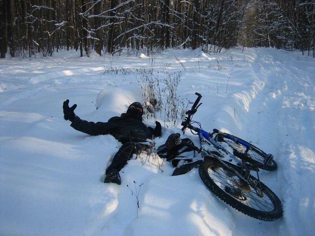 Не вышло. Въехал я в него на полном ходу. Переднее колесо ушло в снег все, а я встал в стоппи и стоял так секунд 5-6, чего-то думал, потом завалился набок. Веселье только начиналось.