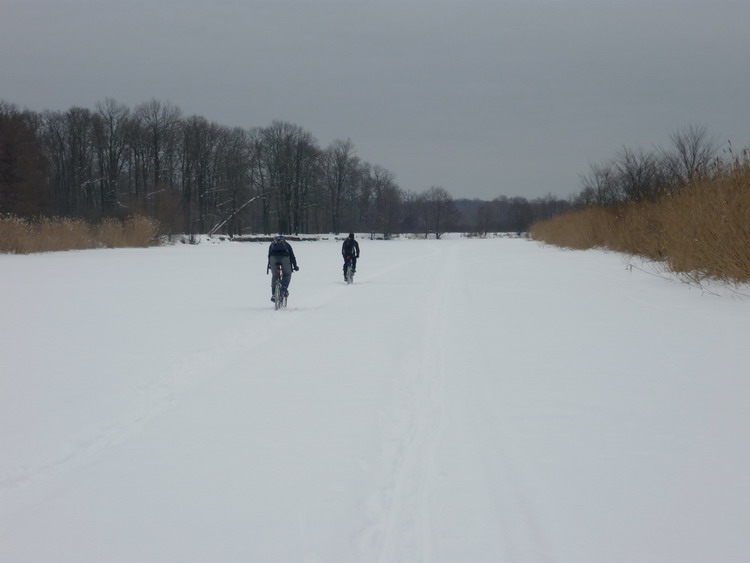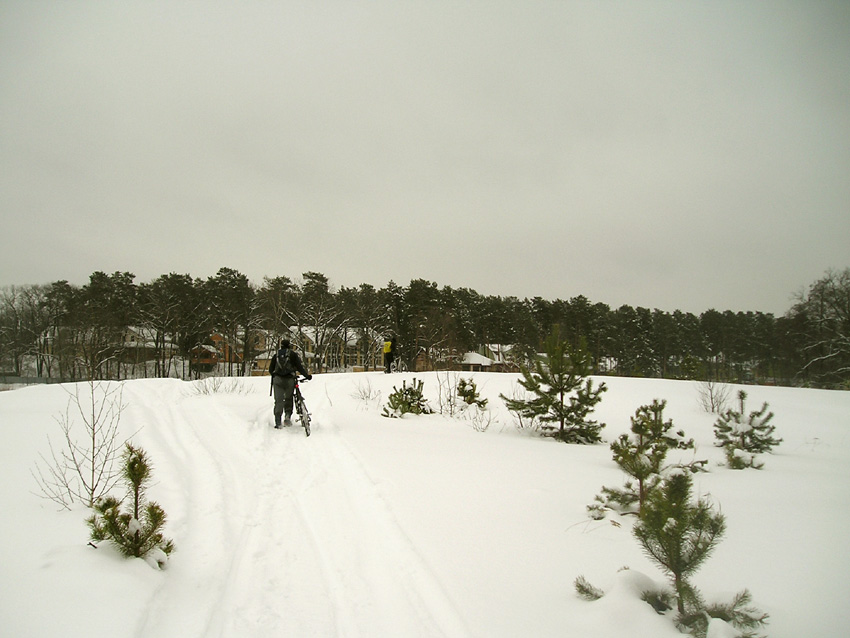 В начале трипа, собираясь на Олимпике, наблюдали лыжный финиш Гали Rangifer. Из лыжниц она была одна. Остальные были лыжники, судя по неярко выраженным половым признакам.. Наверно лыжницы все поотстали. Вчетвером: Недж, Жени, Радлер и я , поехали через Ямное, Ново Живо Тинное в Старо Живо Тинное, Радлеру надо было возвращаться и он уехал по М4 в город. А мы оказались у церкви и кладбища в Ст Жв Тинном. Дальше, к нижнему пруду ехать было нельзя. Пошли по колее. У начала оврага, там где Жени весной упал в ручей этот ручей тек и не замерз.. Только стал еще краше, превратившись в еще одну желтую реку. То ли наблюдалось истечение соков из населенного пункта, то ли еще что. По крайней мере, в соки никто не провалился, а там и дорога стала велы держать. По оврагу шла довольно накатанная колея. В конце оврага, у поймы она свернула вправо. Пришлось ехать туда, а не прямо или налево как обычно. Вскоре попались три встречных джипа, судя по выражению лиц наполненных рыбаками. Колея привела к Староживотинскому затону. На берегу стояли еще две колесницы, а на льду сидели и пытались обмануть рыбу с помощью мормышки и сетей еще не отчаявшиеся рыбаки. Выпытали, что лед на близком Воронеже «сантиметров восемьдесят». Вылезли на Воронеж и то пошли, то поехали по следам рыбаков лыжников и снегохода вверх. На повороте, там где прошлой зимой Иноков купал свой вел, за столиком на берегу сели снедать. Вскоре появился снегоход. На этот раз он ехал берегом. Подъехал к нам и парень начал удивляться и выспрашивать как да что. Объяснили. Наелись и двинули дальше, имея целью Пески. Река наглухо замерзла, но идти было неуютно. Следы рыбаков кончились, остался след снегохода и лыжня. Полезли на левый берег, пытаясь срезать поворот реки, описали кольцо по следу снегохода и вернулись на реку. Потом, услышали шум снегохода в лесу и полезли туда. Это был все тот же парень. Он объяснил, что мест не знает, а ездит куда ни попадя и изучает. Тем не менее, по его следу вышли к элитному жилью на Песках и в конце концов уперлись в закрытые на замок ворота и забор. Чтобы выйти, пришлось лезть через забор. Дальше все пошло легче. Через Коже Венное и вдоль вдхр. Приехали в Отрожку. В лесу видели следы МТБ сегодняшние. Или Владимир или 909, кому ж еще. 80 км, много пеших кусков. До встреч.