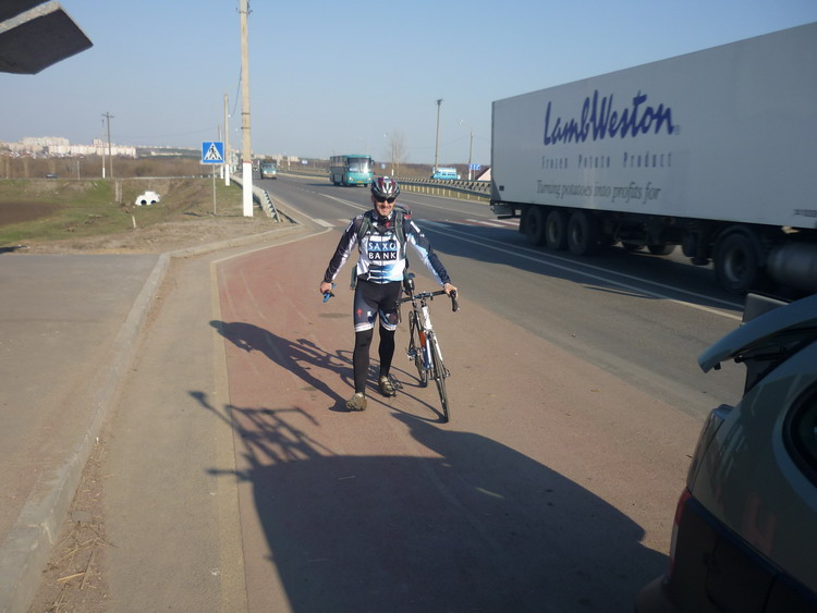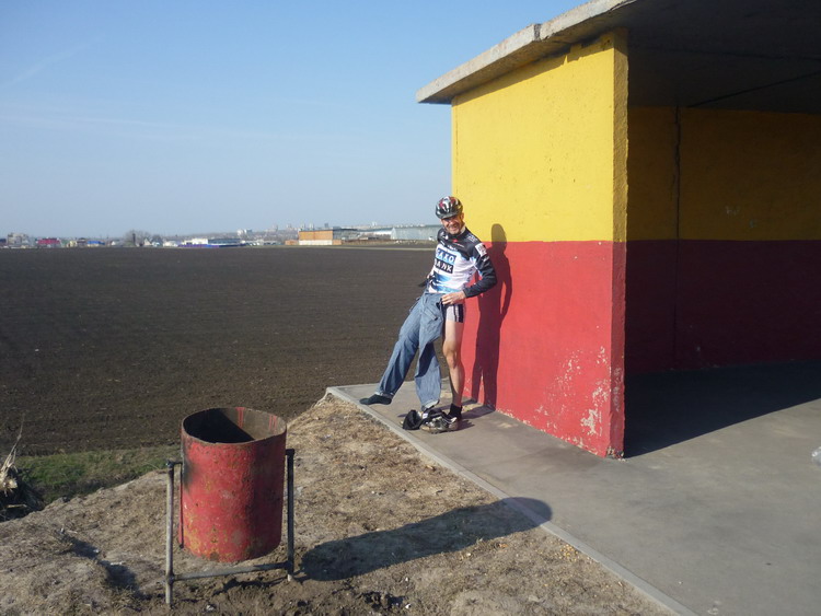 Вернемся на маршрут. Путь туда я запомнил нехорошо. Потому что доехали быстро. Помню аиста в гнезде у дороги. Когда вперед становился Жени, по случаю надвигающейся Пасхи одетый в форму с черепами и аццкими пентограммами, он по обыкновению начинал рвать в подъемы, подворачивающиеся на маршруте. К счастью, подъемов почти не было. Трасса плоская. Ветер туда был непонятный. Скорее, попутно-боковой. За пять километров до КП в Марьино с какой то тайной целью вперед в отрыв ушел Радлер. К тому времени от рюкзака и вобще у меня начала ныть спина и я предвкушал короткий отдых у магазина на КП. Этого не произошло. Оказалось, что Радлер до нашего прибытия успел пробить шесть чеков и, не останавливаясь пришлось разворачивать оглобли и запрыгивать в уходящий поезд ВованаББ. В поезд запрыгнули четверо. Кроме Вована, Владимир Сибиряк, Жени, СДА и я. Принц Проколыч Радлер счел свою миссию выполненной и тут же с успехом прокололся.