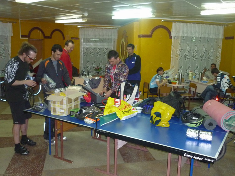 В Курске, по ГПС, причудливым грунтово-аствальдным маршрутом добрались до "Буратино', где нас встретил Хаджи. Вскоре подтянулся экипаж Неджа с Галей, Саном и Укуркиным. Набросились на снедь и на всякие заграничные велофенечки короб которых притащили Еретик и Жени.