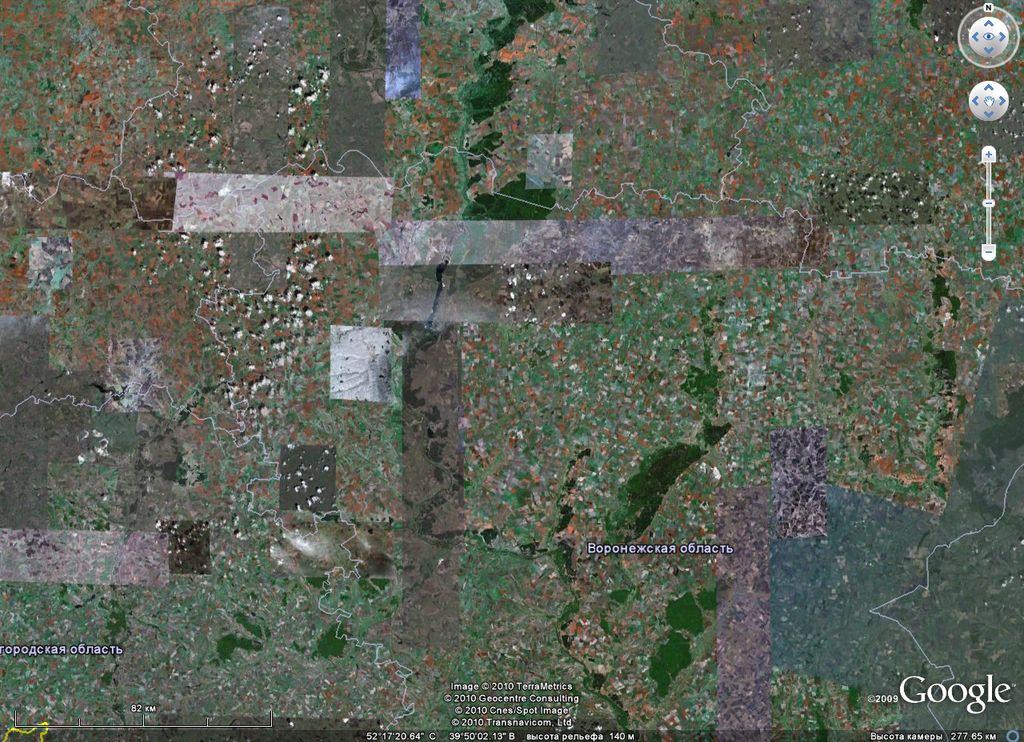 на Гуглях (maps, earth, wikimapia) обновился весь Воронеж с окресностями (от Белой Горы до Балтимора и с Русской Гвоздёвки аж до Эртиля). Добавлены новые участки. И положение спутника и освещение Солнцем хорошо сочетаются - там где хвойный лес, видно тропки, дорожки.