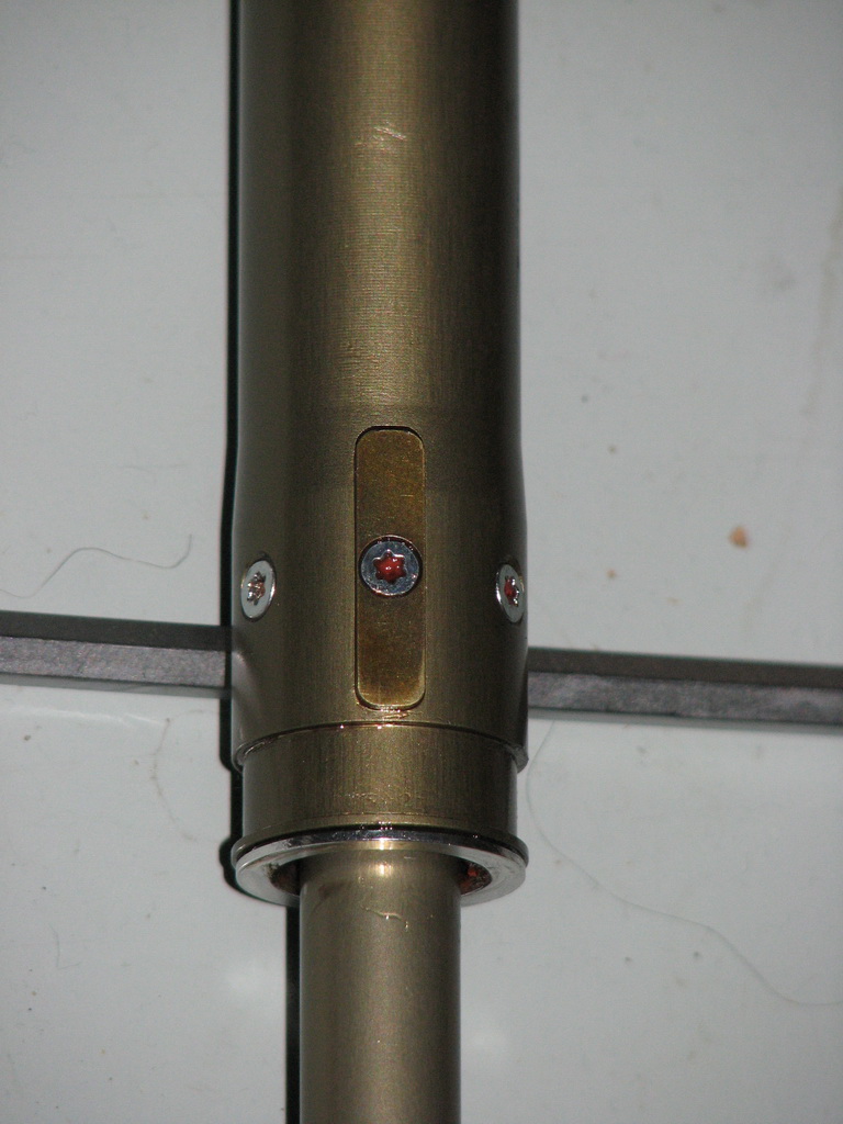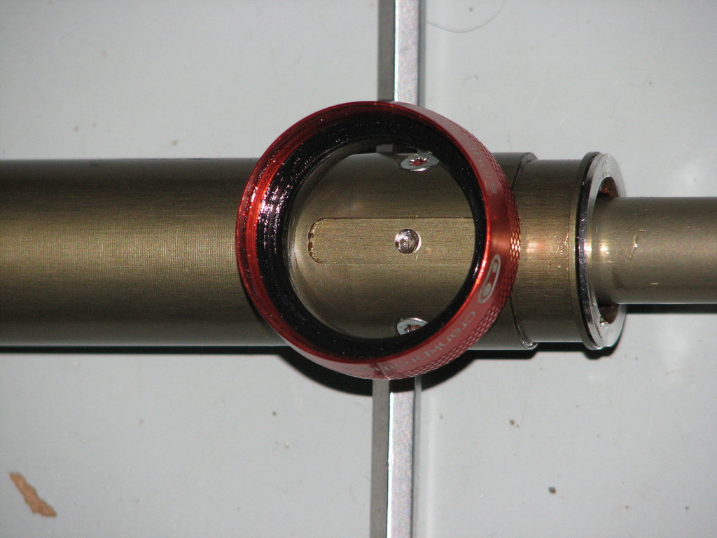 1. Снимает подседельник с байка, очищаем его от пыли, песка, грязи. 2. На конце, со стороны внешней черной трубы, с торца, наличествует гайка, крепящая внутренний (активный) шток подседельника. Откручиваем ее головкой на 10 с удлинителем (я использовал длинный шестигранник). 3. После того, как гайка с торца откручена, руками отворачиваем красивое красное колечко. 4. Вынимаем внутреннюю часть подседельника из черной внешней трубы.