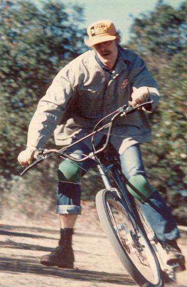 MTB конца 70х - начала 80х. Велосипед: стальная рама, широченный руль, никаких амортизаторов, вместо дисков - барабанный тормоз, никаких индексных манеток еще не придумали. Велоформа: хб футболка и джинсы. Защита: наколенники (что на велосипеде надо ездить в шлеме, никто не задумывался, видимо, в то время).