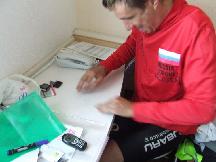 Только теперь наступил велосипедный этап путешествия. Сначала надо былоехать искать СенКвентин и стадион, с которого вечером предстояло стартовать. Поскольку профи-командная раскраска на ПБП запрещена, вместо любимых маек пришлось вырядиться в наскоро приобретенные еще в Воронеже, в Декатлоне гнусные подобия джерси от БиТвин. На свою майку я пришил кусок буксирной ленты от машины, окрашенной в цвет российского триколора. Чтобы обозначить государственную принадлежность. Этого показалось мало. Поэтому перед выездом из гостиницы, разложив майки на белом пластиковом столе, я несмываемым маркером вывел на них "RUSSIA", "Voronezh" и "Velo36". К моему неописуемому ужасу, оказалось, что надписи, кроме майки остались и на поверхности гостиничного стола. Как пел классик:"В общественном парижском туалете есть надписи на русском языке..." А тут на надписи и страна и город и сайт. Ясно кому предъявлять счет за порчу гостиничного имущества. Попытки смыть