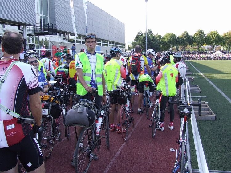 при дворце, где делалась мировая история. К СенКвентину пришлось лезть в подъем. На подходах к стадиону стали встречаться прицепы-дачи с иностранными номерами а вскоре наткнулись и на первых волонтеров, показывающих руками, куда рулить. На въезде на стадион попали в лапы первых двух контролеров. Они проверили тормоза, передний и задний свет и наличие светоотражающей жилетки. Долго обсуждали между собой мои рулевые рога, но потом махнули рукой - мол ОК - все в порядке, и пропустили на стадион. Оставили велы рядом с привлекающим всеобщее внимание веломобилем, а сами отправились для дальнейшей регистрации в зал. Наши опасения по поводу вчерашней неявки развеялись. Никто и слова не сказал. Дали планшет, номера, карточку, чип, медаль суперрандоннера за 2011г. Среди волонтеров была русская девушка из Челябинска - Чехии, дочь одного из участников. Она нам все и объяснила. На стадионе выдали официальные джерси, фляжку. Радлеру выдали жилетку. В палатках торговали майками, изотониками, всякими велоприбамбасами. Два английских веломужика у своего стенда рекламировали пробег Лондон - Эдинбург - Лондон. Не такой раскрученный, как ПБП (в 2009г. 750 участников, в том числе и россияне), но проходящий тоже раз в 4 года со сдвигом относительно ПБП в 2 года. То есть следующий в 2013 году. Дистанция 1400км. Меня заинтересовало. Взял у них брошюрку. В общем, поскольку народу с утра было немного, с регистрацией управились быстро и отправились в гостиницу отдохнуть перед стартом. Обратно в гостиницу ехали покороче - через Версальский парк. Это очень популярное место отдыха. На траве сидят, по дорожкам бегают и ездят на велосипедах (только там видел МТБ, в остальном Париже ездят на дешевых турингах, коммьютерах, шоссерах), по пруду катаются на лодках. Из отдаленного дворца несется симфоническая музыка. На лугу устроена овчарня и живут