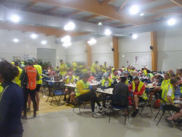 Вечером двинули на старт знакомой дорогой через версальский парк. Жара была за 30. Вокруг стадиона клокотало море участников и провожающих. От стартовых ворот неслись непонятные французские вопли затейников. Выпускали пачками человек по 300. Чтобы попасть в стартовым воротам надо было пристроиться в хвост длинной очереди, медленно двигаться с ней на стадион, по беговой дорожке пройти пол - стадиона, выйти через другой выход и оказаться наконец у стартовых ворот. Все это заняло у нас часа два. Я пристроился в хвост очереди, а Радлер отправился искать БадАдмина и пропал. Тем временем, мимо меня прошли многие россияне, включаю наших волгоградских закоперщиков. Радлер наконец появился и мы затесались в толпу американцев. Они уважительно отнеслись к моему навъюченному багажнику. Я пояснил им, что везу одежду для зимовки. В толпе нашли челябинцев и пристроились к ним. Наконец получили первый штамп в карточке и оказались у стартовых ворот, где долго слушали непонятные возгласы тамады на трибуне. Из всего я понял только "ОЛЕЕЕЕ!!!" Это вроде нашего "Х_як!" Вобще с английским во Франции беда. После серии из "ОЛЕЕЕ!!!" стартанули в сопровождении мотоциклистов. Передние очень резво ушли вперед. Челябинцы не спешили и ехали 25. Это был неудобный темп. Жители окрестностей стояли вдоль дороги и ликовали. Дети тянули руки, чтобы проезжающие велогерои могли хлопнуть их по ладошке. Вскоре ладошки почернели. Пелетон въехал в черные пригороды. По обочинам стояли сплошные негры. Непривычно. Потом пригороды кончились и началась Франция. С полями, буковыми лесами и сплощными спусками - подъемами. Ни единого плоского участка. Когда спрашивают на что похоже по рельефу в Воронеже, трудно подобрать сравнение. Похоже на подмосковье, смоленщину, Латвию. Вобщем на ледниковые холмы. В лесу похоже на Олимпик там где горки с фонарями заасфальтированы. Очень быстро Андрюша устал ехать медленно и поехал нормально. Мы начали обгонять группы стартовавших с нами. Через некоторое время начали обгонять группы стартовавшие перед нами. Обернувшись, я обнаружил, что мы едем в голове довольно внушительного коллектива, которому пришелся по душе взятый нами темп. Уже потемнело. С холма на холм текла сплошная красная река из велофонариков . Красиво. Попытки залезть на встречку пресекались курсирующими наблюдателями на мотоциклах и стоящими в темноте у дороги контролерами из волонтеров. Поток был плотный, поэтому приходилось все время орать "аттеншн лефт", чтобы посторонились и пропустили. Каждые километров 10-15 встречалась очередные деревни, или скорее городки с мощеными улицами, двухэтажными домами, церковью на главной площали. Жители во всю праздновали ПБП. У дороги стояли столы с яствами и вином. Приветствия сыпались градом. Ощушение праздника - это то ради чего надо ехать ПБП. К первой сотне за Радлером и мной
