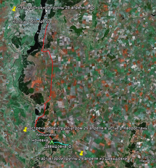 Группа №1 стартует 28 апреля в 9-00 от кольца ОблГаи (левый берег) и двигается через Нововоронеж и Аношкино к устью р.Хворостань. Разбивает лагерь становиться на ночевку