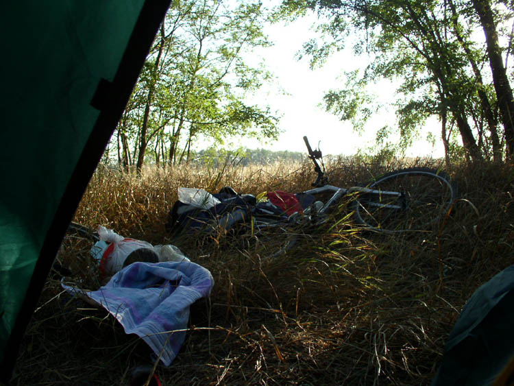 Темнеет, бывшая еще часа два назад шутка что ночуем в полях становится реальностью и мы забираемся в какую то посадку перпендикулярную дороге. Пухлый ковер какой то мягкой сухой травы покрывает землю. Решаем костер не разводить дабы не сжечь все (следующим вечером в голову прийдет простая мысль о том что костер можно развести рядом на поле). Соответственно теперь не очень нужные запасы воды Юля тратит на купание. Ложимся спать. Хм, кто то шуршит рядом с палаткой. Теперь с другой стороны. Опять слева. Сильнее.