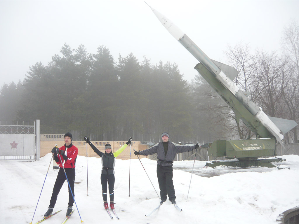 Оказалось, что это жилой поселок возле какой-то военной части, мы даже сфоткались около её входа у ракеты (надеюсь, фотки будут ниже  ). Потом ещё покатались по лыжням-колеям, доехали до той самой бетонки, проехались по ней туда-сюда, и понемногу вернулись назад. Перед самым городом Андрей умудрился сломать лыжу, когда ехал коньком внутри рельсов железки... Но скользящее полотно цело, надеюсь, вылечится шиной с клеем.
