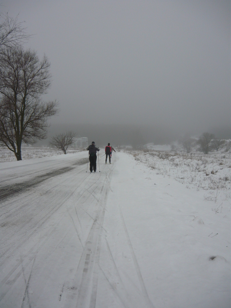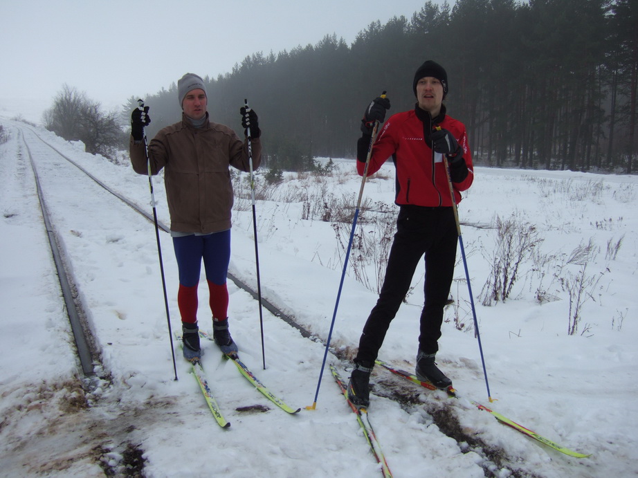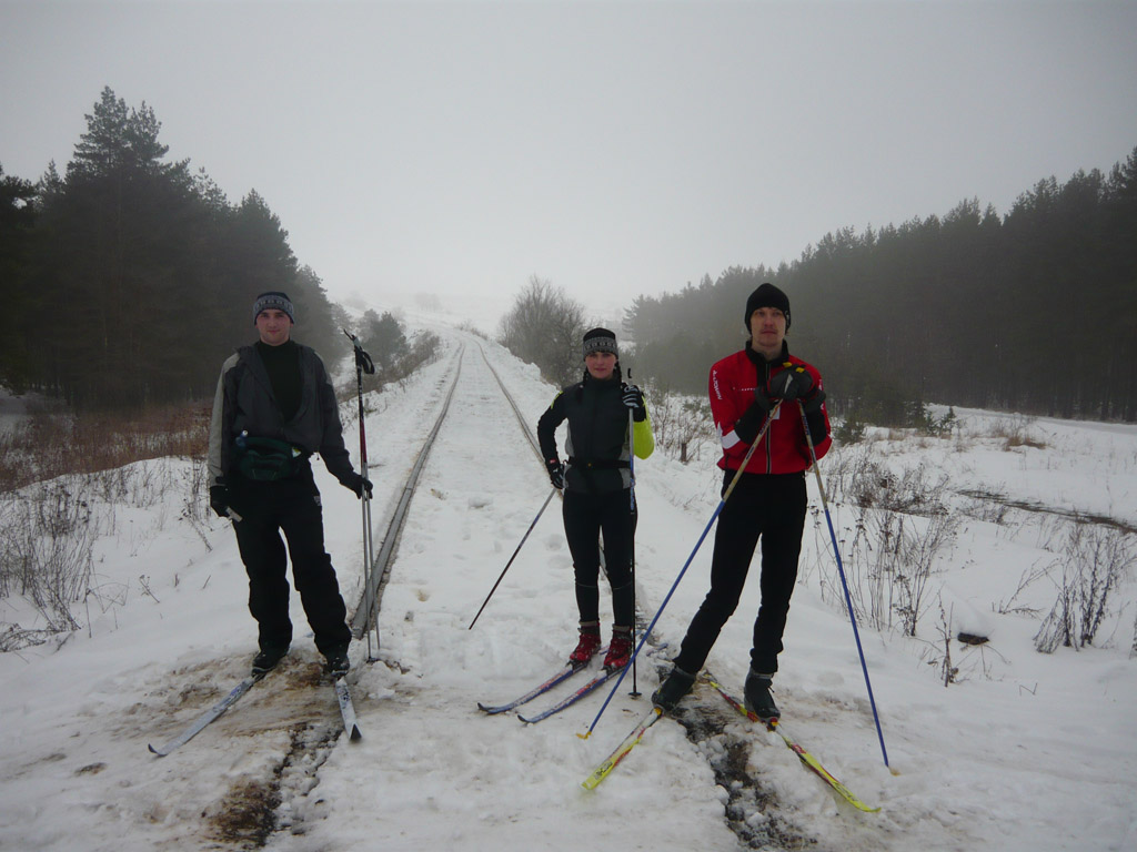 ). Потом ещё покатались по лыжням-колеям, доехали до той самой бетонки, проехались по ней туда-сюда, и понемногу вернулись назад. Перед самым городом Андрей умудрился сломать лыжу, когда ехал коньком внутри рельсов железки... Но скользящее полотно цело, надеюсь, вылечится шиной с клеем.Однозначно не последний раз!
