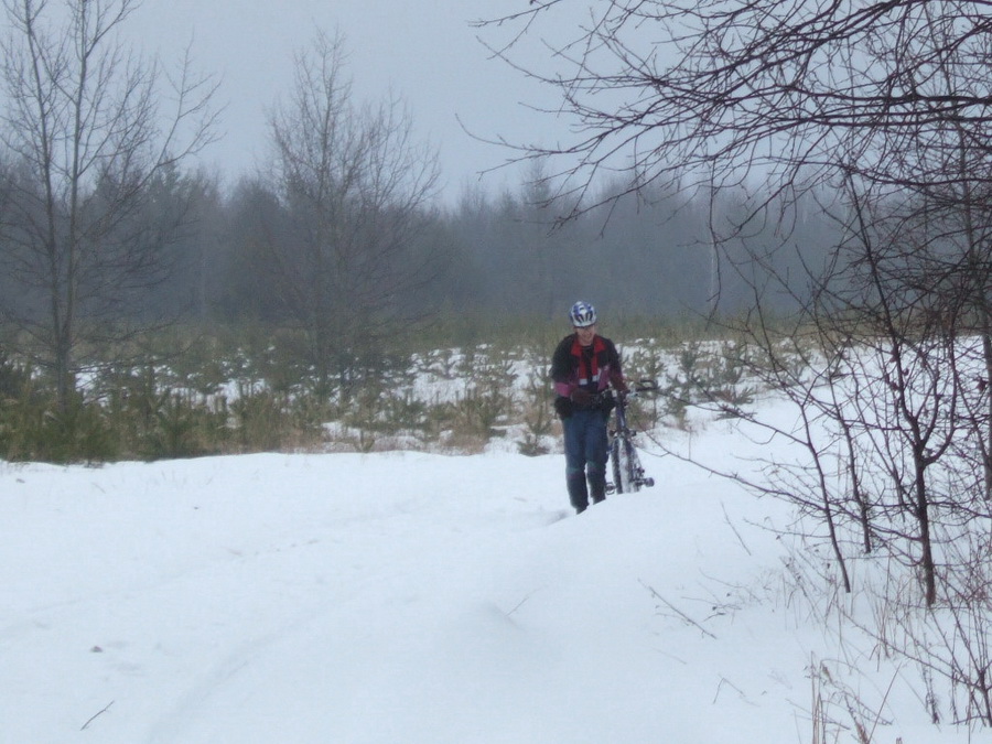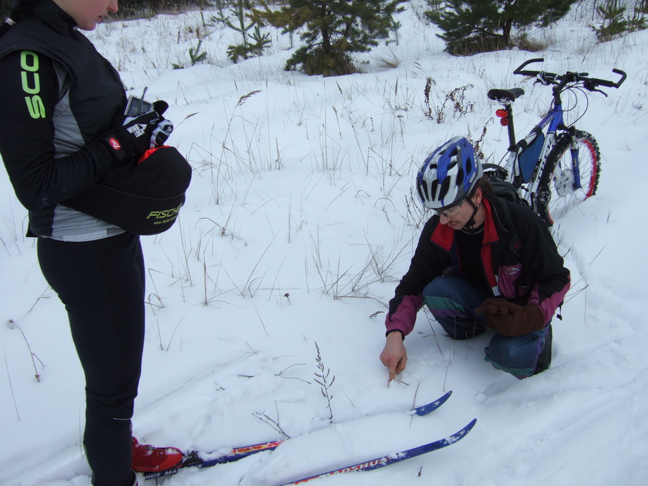 Было 4-ро на лыжах и Кипер на велике  Ехали и по шпалам между рельсов, и по тропинкам, и по хорошо укатанным дорогам и не очень... Когда началась дорога с рыхлым снегом и следами от всего одной проехавшей машины, Кипер, пройдя с полкилометра пешком, решил что дальше нет смысла мучаться. Мы направили его прямейшим пешим маршрутом до проезжабельной дороги, а сами поехали дальше. Кипер оказался прозорлив - дальше началась уже просто лыжня в лесу (о чем предупреждал Владимир в ветке о минипокатушках