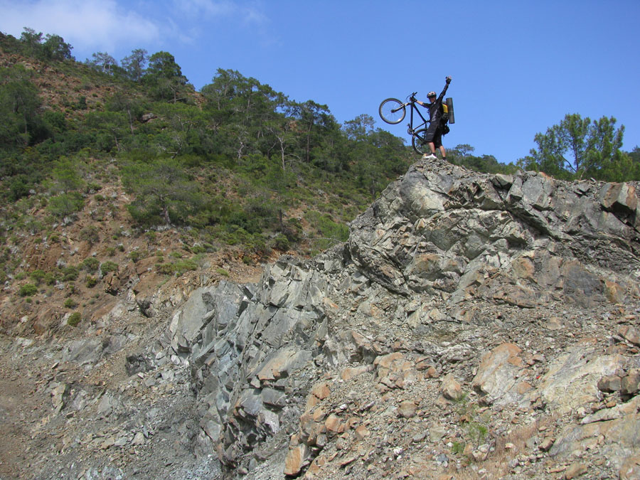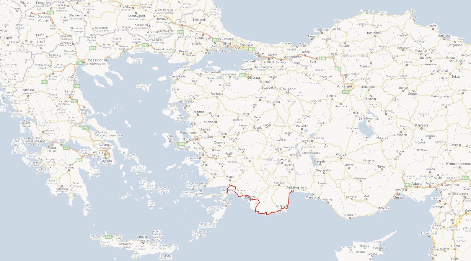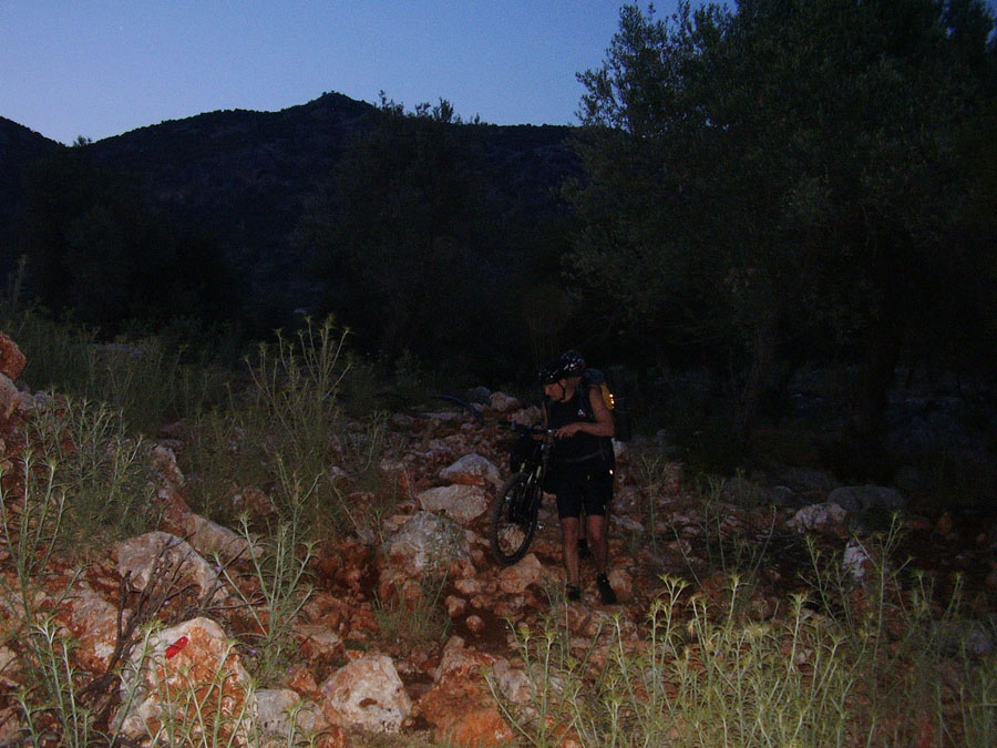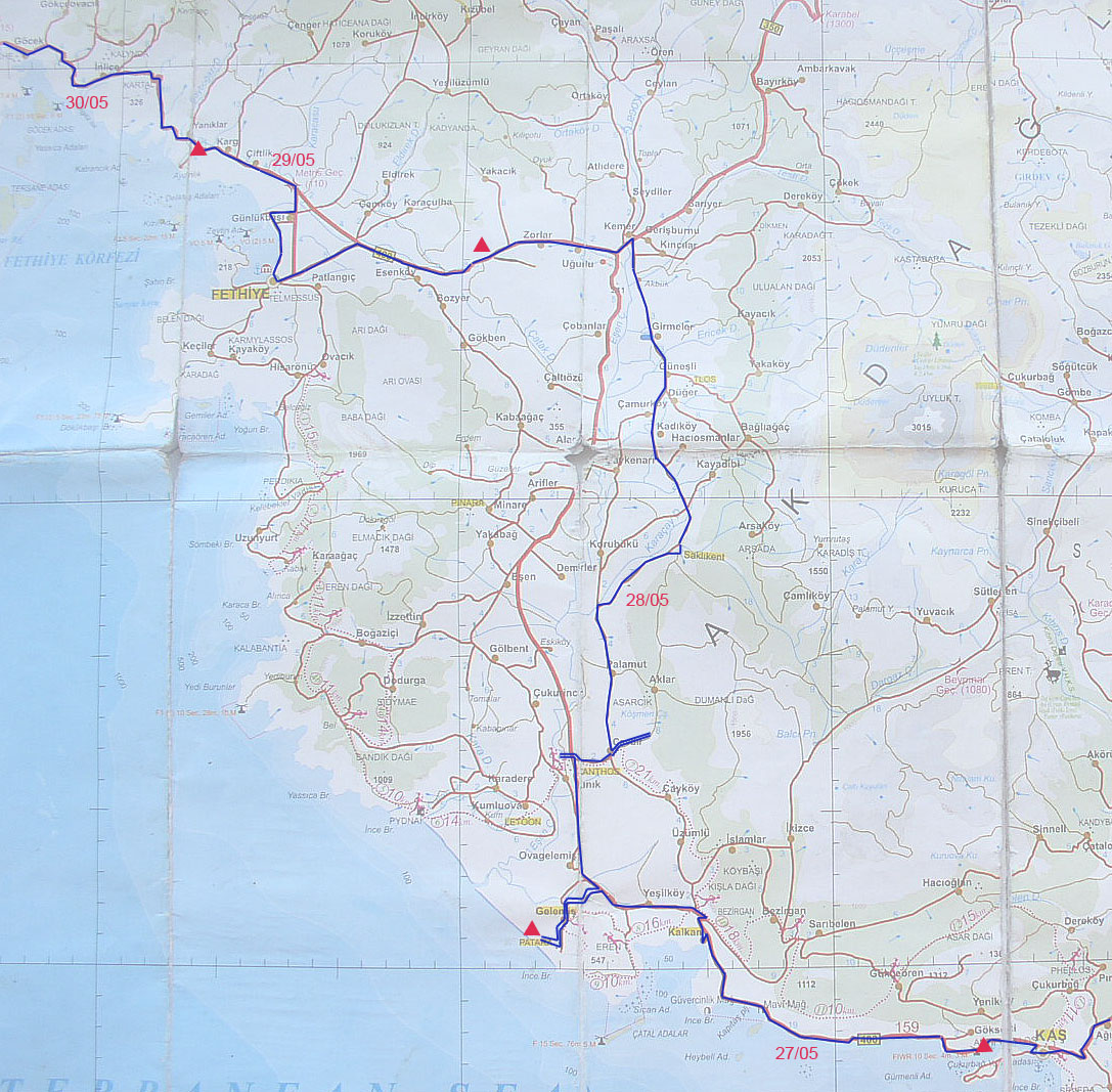 Seliff: Выдвинулись поздно, часов в 12-13, в самую жару, море и пляж не хотели отпускать. Выбрались на дорогу и покатили в сторону Финике. Быстро докатив до центра, нашли супермаркет, закупились водой и покатили дальше в Demre, обалденная горная дорога, вверх-вниз, двухполосная асфальтовая трасса, серпантином вилась в горах, виды потрясающие. Гоняясь друг с другом выкатили к бухточке под названием (В…) и обогнув ее вкатили в Demre, проехали его и уже на выезде, посмотрев карту, решили осмотреть местные достопримечательности. Вернулись первым делом в центр и закупились в супермаркете, после чего решили заехать посмотреть местные развалины и заехали в небольшую бухточку, где вышел турок, европейской национальности, полупьяный и предложил кемпинг по 5 лир с человека. Посовещавшись, решили поторговаться, после осмотра кемпинга, после чего предложить ему вместо 20ти -15 лир. На это предложение он не согласился, да и вообще всей команде не очень понравилось отношение со стороны этих людей, поэтому мы развернулись и поехали искать ночевку. В принципе, мы поели недавно, поэтому хотелось еще покататься. Вот мы и поехали дальше немного отъехав и сверившись с картой решили снова попробовать прокатиться по Liken Way. Свернули по указателю, по карте дорога вела к морю, точнее путь, сначала была грунтовка, из щебня, затем начался спуск, довольно крутой и дорога раздваивалась. Пообщавшись с местным населением, двинулись в сторону моря. Через несколько десятков метров дорога кончилась и начались камни, спуск. Женщина что-то долго кричала, типа ёок!-конец дороги, но уже темнело, поэтому решили идти дальше, спустив по-двое велики продолжили движение. Путь представлял собой уклон с большим количеством камней и колючек, а также кучей комаров. В итоге уперлись в каменный забор, точнее его остатки. Там и нашли ровное место, без камней для палатки. Поставили тенты, перекусили чаем с бутерами (согрели на грелке) и легли спать.