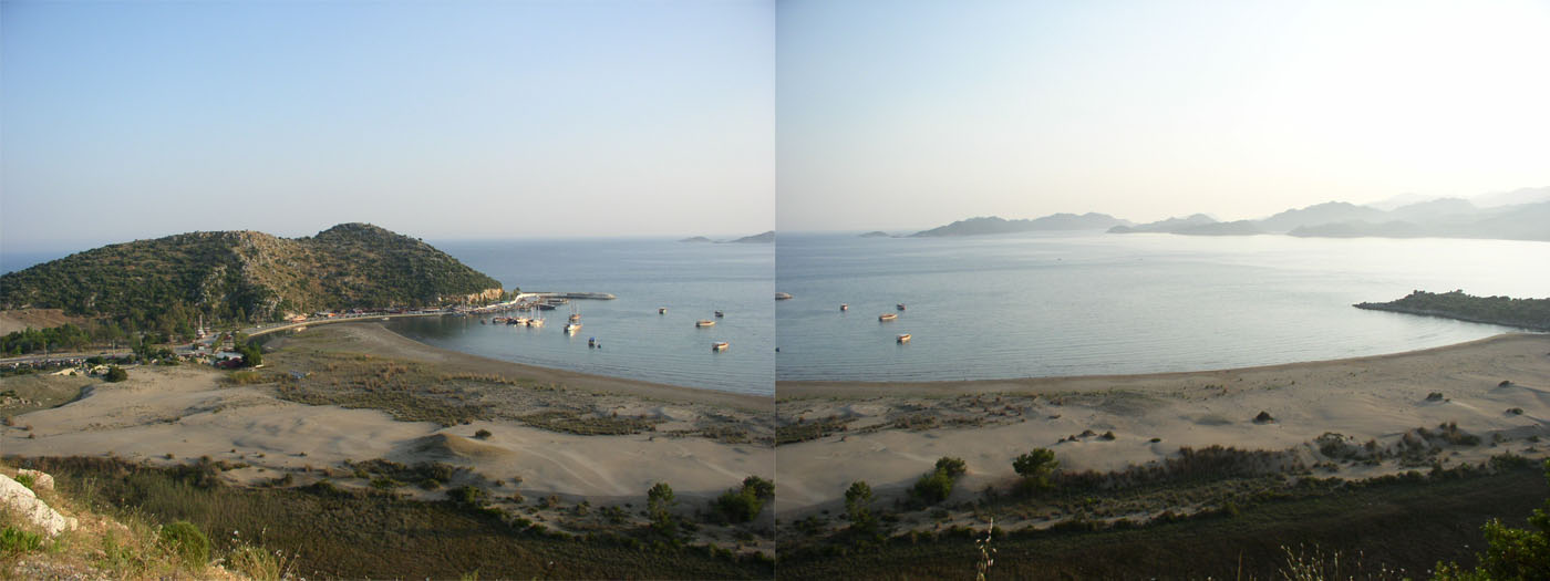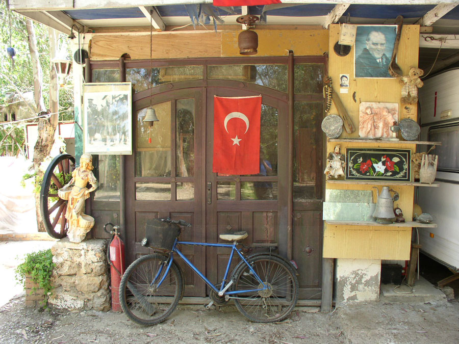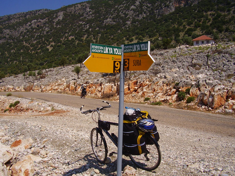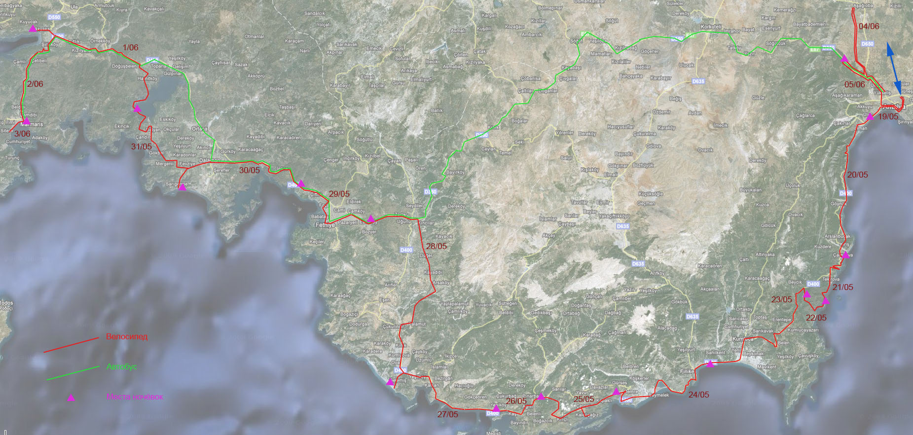 Seliff: Утром встали в 6.30 и ,позавтракав, стали собираться . Попрощавшись с Ису, двинули дальше по дороге на Фетхие. Отличная горная дорога, вдоль моря, ехать очень комфортно и температура воздуха ниже, чем вчера, вверх-вниз и так до Калкана. Небольшой с виду городишко с отличным пляжем и узенькими улочками, в общем, как обычно. Находим укромное местечко около скал, в тени и останавливаемся там, переждать жару. До пляжа 100-200 метров. Купаемся, загораем. Часов в 16.00 примерно, выдвигаемся в центр, заезжаем на автобусную станцию и узнаем, что за переезд в Анталию берут 16 лир+столько же за велы. Дальше в супермаркет, берем молочное и хлеб и по ходу меняем баксы на лиры. В Интернет-Салоне переливаем фотки на флешки. Курс лиры 1,51=1S. Час в салоне 2 лиры, т.е.40 рублей.Звоню любимой, разговариваю минут 10, закончилась первая карта, купил еще одну. Решаем ехать дальше с заездом в Патару, где и найти новую ночевку. Из выезда из города опять нехилый подъем, затем стремительный спуск и вот поворот на Потару. Небольшая остановка на остановке. Дарим календарик velo36, местным любознательным детишкам. (В Калкане встретили пару из Австрии (Вена) Клаус и девушка (не помню имени), которые из Австрии едут на великах, оставив их в Олю Дениз , пошли пешком по Люсиан Вею.Велы у них уже с тележками). Сделали фото на память. Поворачиваем на Потару, древнее место, развалины, вход 5 лир с человека. Я 2 раза теряюсь, Вовка получает около 6 проколов, Леха один прокол. Находим место в дюнах, на закрытом пляже, где должны откладывать яйца морские черепахи.Черепах и яиц там не обнаружили, зато нашли тихое местечко в песках для ночёвки.