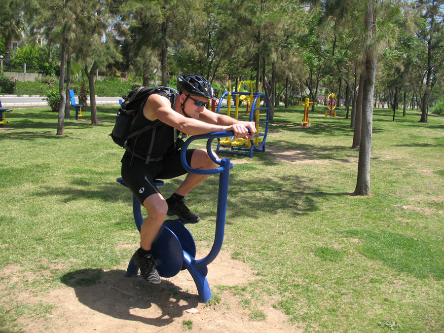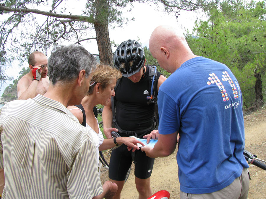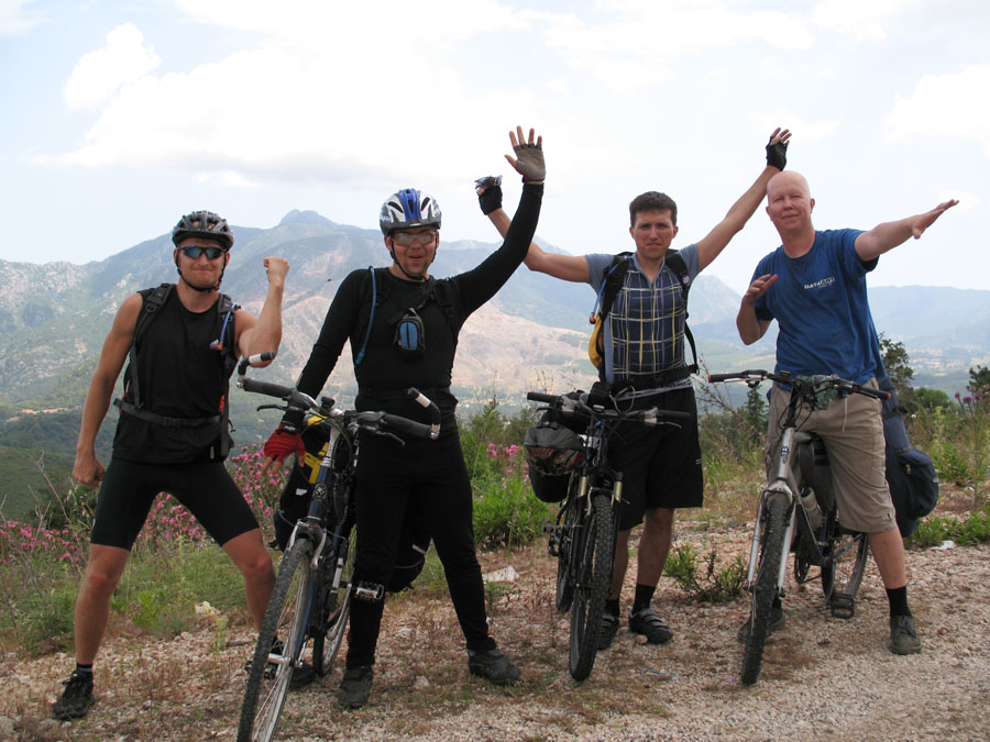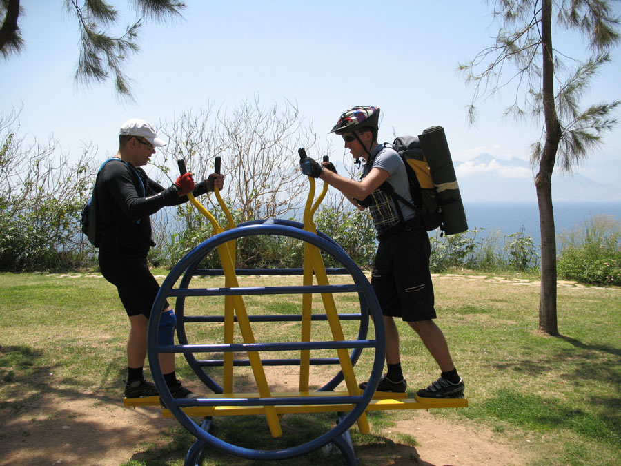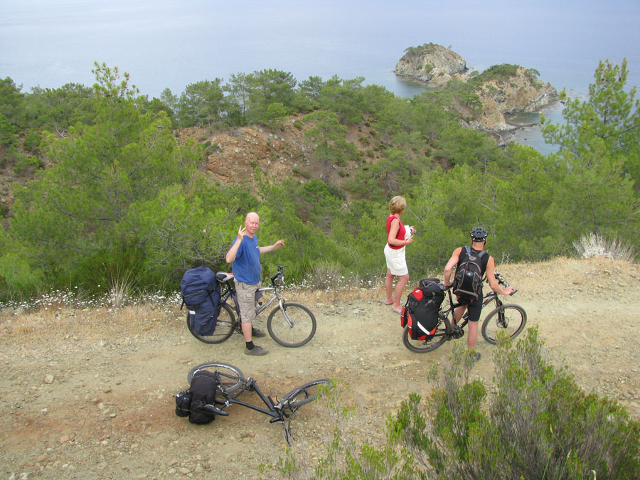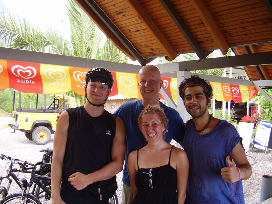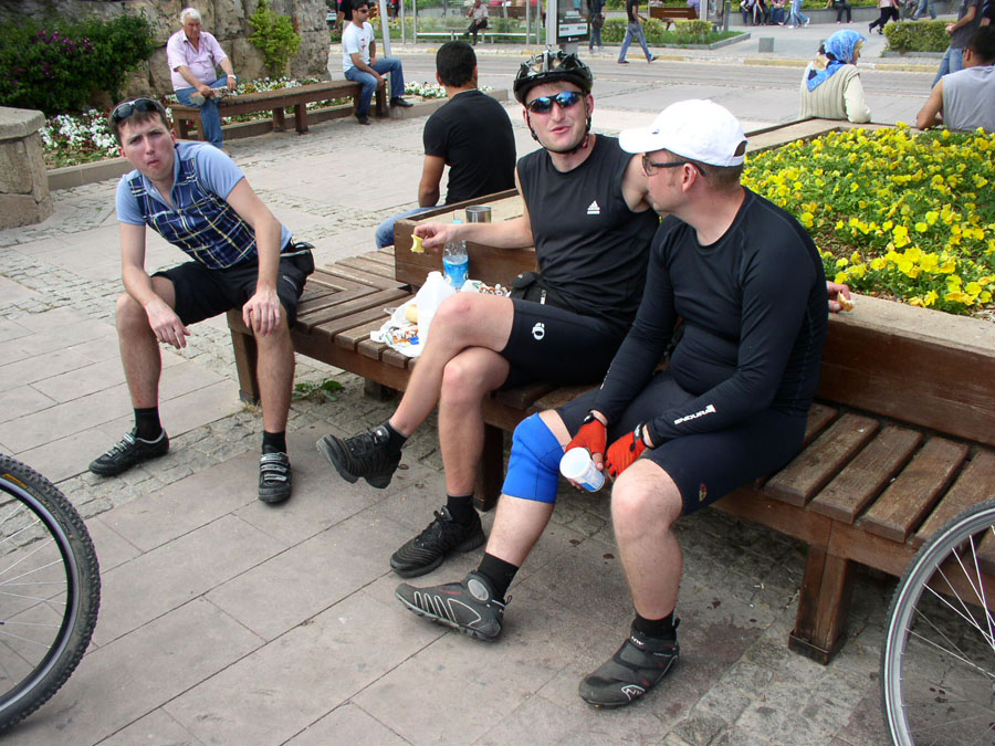 Seliff: Встаем в 7.00 (вороны разбудили). Готовим кашу с консервами, собираемся и выдвигаемся в Фетхие. Выехав к дороге, еще раз проверяем колеса на предмет колючек. Впереди около 20-ти километров по шоссе. Солнце почти в зените, но на удивление не очень жарко, в тени 25 градусов. Катим, пытаясь найти очередной источник с пресной водой. Видим знак, показывающий, что здесь есть вода, останавливаемся, но найти его так и не смогли. Едем дальше и въезжаем в пригород Фетхие. Останавливаемся около мото-вело мастерской, где все, кроме меня покупают запасные камеры(ещё остались запасные). Едем дальше в центр, останавливаемся около супермаркета, Вовка на улице (меняет камеру), мы идем за хлебом, молоком вареньем. Возвратясь к велам, обнаруживаем свору местных ребятишек, суетящихся и кричащих вокруг наших велов и Вовки. Он пытается отбиваться. Леха, на какое-то время отвлекает их цирковыми номерами, чтобы Вовка мог наконец-то поменять камеру. Разливаем воду, фоткаемся и решаем отъехать метров на 300, чтобы собраться с мыслями, после этого фонтана жизни. Останавливаемся, проверяем всё ли месте, вроде всё нормально.(Перед этим на шоссе встретили двух англичан, которые в пути уже 60 дней, едут прям из Англии, зовут Jeff и Duncan. У них маршрут вокруг Средиземного моря. Коротенько делимся впечатлениями. Для такого серьезного похода, у них довольно мало вещей. Удивляются, глядя на наши велоштаны ( у них всё раздельно, по бокам и спереди, сумка на руле, внушительных размеров). По их словам в день проезжают по 100-120 км. Вело- гибриды с жесткой вилкой, колёса 28 дюймов. Желаем удачи, прощаемся, дарим календарики Velo36. Едем дальше в центр. Находим небольшой скверик, останавливаемся, кушаем йогурты с вареньем и хлебом (батон). Рядом подсаживается англичанин, разговариваемся. Пока я с ним болтаю, остальные члены команды тихо уходят в город. Дождавшись их возвращения иду искать Интернет-Салон и туалет. Сначала нахожу платный туалет, но платить 10 рублей за вход не хочу и иду дальше (Весь поход проходит под позитивными лозунгами: Проблем нет!-Есть их решения! Нам опять везет! Всё отлично! Вовка никуда не спешит! Жуки работают! Жуки отдыхают! Опять жрать! Делим всё по-справедливости!).