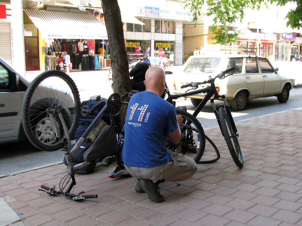 Активное копание в велоштанах, заставило нас ввести основополагающий термин “Жизнеобеспечение”, объединяющий все действия, не связанные с непосредственным движением по маршруту. А сами участники во время этого действия, соответственно, называются “навозными жуками”. К обеду “жуки” отправились смотреть город, попутно cкупая дополнительное снаряжение. СергейП хотел было вырваться из этого порочного круга, попробовав радостно срулить в центр, желая навестить кого-то из знакомых, но сломав трещетку он был немедленно возвращен к традиционному решению проблем жизнеобеспечения.
