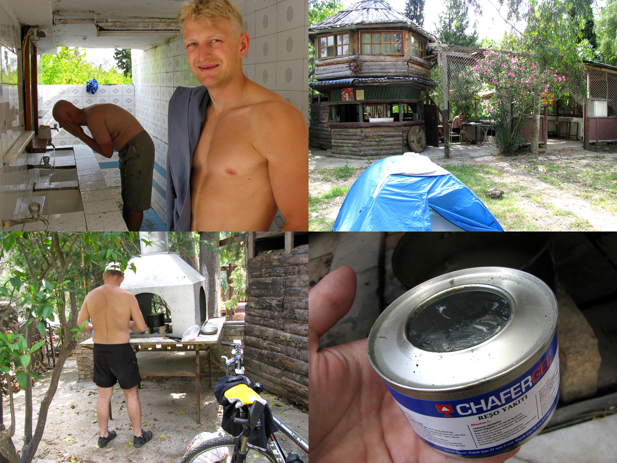Алексей сразу почувствовал подвох, мол, что это он клиентов конкуренту направляет, но всё равно поехали. Когда нашли этот кемпинг, местный парнишка назвал ту же цену, т.е. 40 лир, за всех и тоже торговаться не стал, что навело на мысль о сговоре между ними, а может, хозяин один и он позвонил этому и сказал, что вот едут лохи, цену не сбавляй, в общем, мы поехали дальше и через пятьсот метров обнаружили отличный закрытый пляж. Зайдя на территорию, и поговорив с приятным, улыбающимся управляющим по имени Ису , договорились за 25 лир переночевать с душем, туалетом, электричеством. Первый раз побрился после прилета в Турцию. Принял душ с гелем, класс!