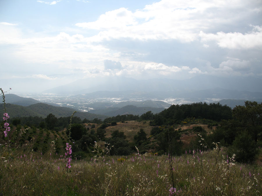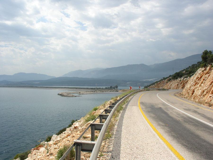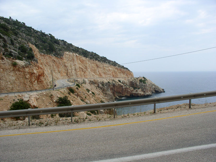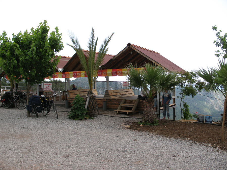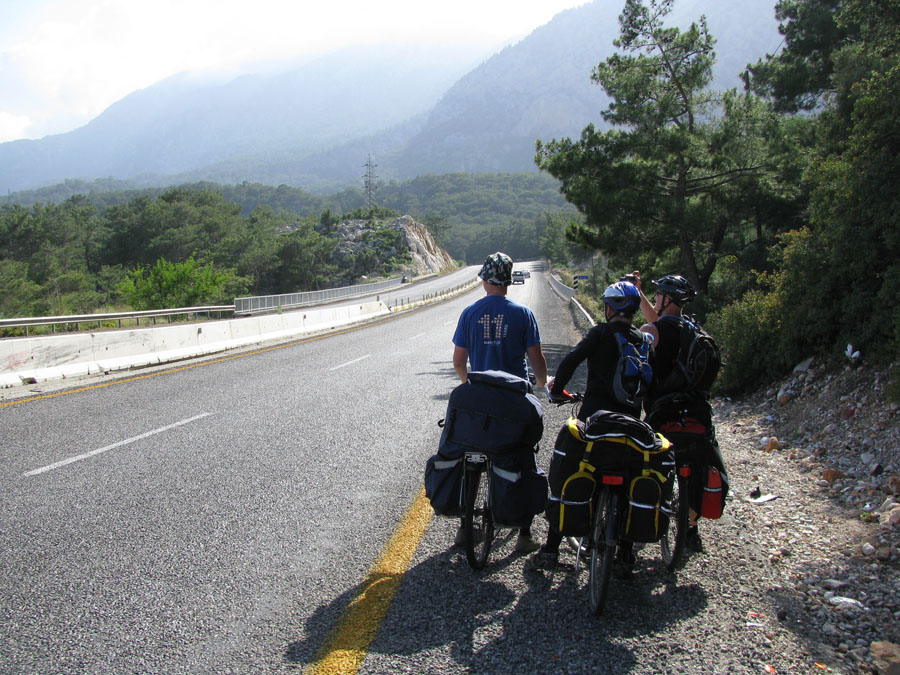 Seliff: Утром после крика Сергея П подъем, встаем, собираемся, я пишу заметки, уже собравшись, за 22.05 (прошли 20 км). Немного ждем Вовку и трогаемся в путь. Дорога ведет теперь всё время вниз. Скатываемся и вот она, главная дорога. Влезли мы на нее между Чирали и Фазелисом и двинулись в сторону Кумлуджи. Сначала хотели завернуть опять в горы, но отсутствие нормальных магазинов нас отпугнула. Вообще сложилось впечатление, что в курортных зонах есть только небольшие ресторанчики-кафешки, а магазинов там практически нет, видимо местное население закупать продукты ездит в другие места, более крупные населенные пункты, чтобы туристам негде было сэкономить, и приходилось бы питаться в этих забегаловках. В общем, покатавшись немного вверх-вниз, в поисках очередного «супермаркета»(так они называют киоски или павильоны), решили ехать до Кумлуджи по основной трассе. Виды по дороге открывались конечно, потрясающие, что мы собственно и дружно запечатлевали на своих фотокамерах. Остановились около очередной кафешки пофоткать, решили заодно перекусить. Взяли что-то похожее на шаверму (лаваш с сыром, похожим на творог и картошка) 3 лиры за штуку. Там встретили путешествующего с девушкой турка Али, который прилично изъяснялся на английском и был в нескольких городах в России. Особо ничего нового мы от него не узнали, но получили пожелания удачного пути. Проехав еще немного и остановившись пофоткать очередной прекрасный вид встретились с российской парой с ребенком, которые взяли на машину на прокат на неделю (40 S в день) и путешествуют.