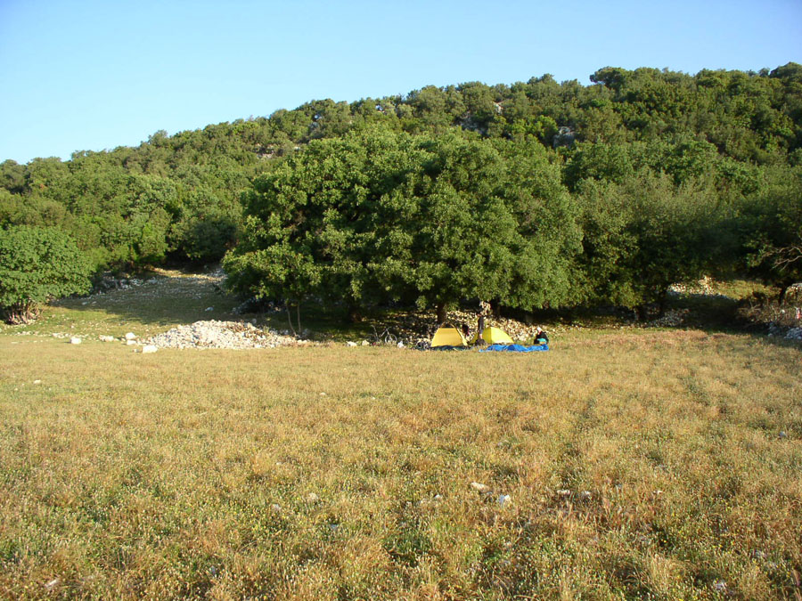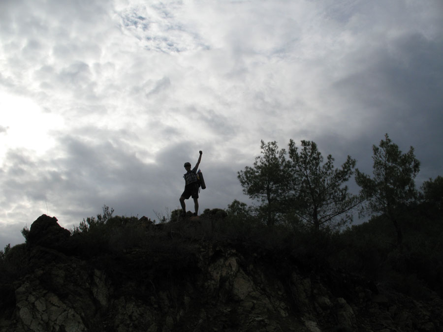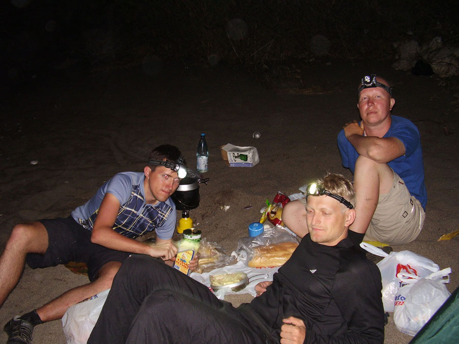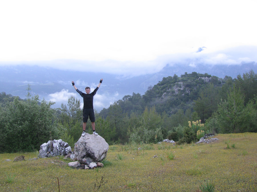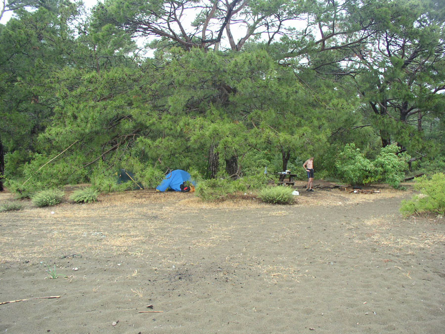 Seliff: Я встал часов в 6, искупался, сел марать бумагу и через некоторое время заметил местного охранника, который внимательно разглядывал наши палатки. Сообщил об этом остальным и мы стали собираться. К концу сборов пошел дождь, который шел еще ночью! Закрыли непромокаемыми чехлами рюкзаки и штаны, отправились в путь. На карте нашли Фазелис (древние руины, решили заехать посмотреть, что и было сделано). На входе с нас содрали по 8 лир (160 рублей примерно) и мы заехали внутрь. Прикольная бухточка с кусающимися рыбешками, развалины. Отдохнув, пофоткав пообедали. Опять русская речь слышится постоянно. Разговорились с парой из Питера и уточнили у него пеший маршрут до Олимпуса и решили ехать по нему. Начинался он в деревушке Tekirova, где мы закупились провизией, я перелил фотки из фотика на флешку и там же за 30 лир купили наконец-то горелку! Нашли поворот в горы и полезли наверх. Поначалу всё мое естество воспротивилось этому действию. т.к. идти пришлось пешком и по очень хреновой дороге, но большинство решило идти, и я согласился, о чем впрочем не жалею. Прошли мы по этому пути 10-14 км. Нашли отличную бухту, источник с питьевой водой и остановились на ночевку. Я не стал дожидаться ужина, поставил палатку и завалился спать.