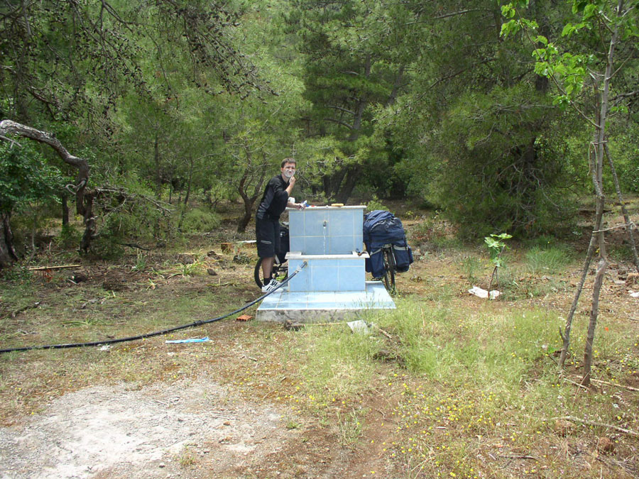 Seliff: Встаем в 7.00. Рядом источник с питьевой водой. Готовим рожки с консервами, едим, стираемся, купаемся, собираемся. 13.00 еще не выехали. Да, в Фетхие купил очередную подножку за 10 лир(купленная в Киеве за 60 гривен, сломалась), пока держится. Решил поставить сразу 2, может со штанами будут держать. Выдвигаемся по горной дороге вверх, самое пекло. Подъем довольно долгий, около очередного источника останавливаемся и обливаемся прохладной водой. Едем дальше.