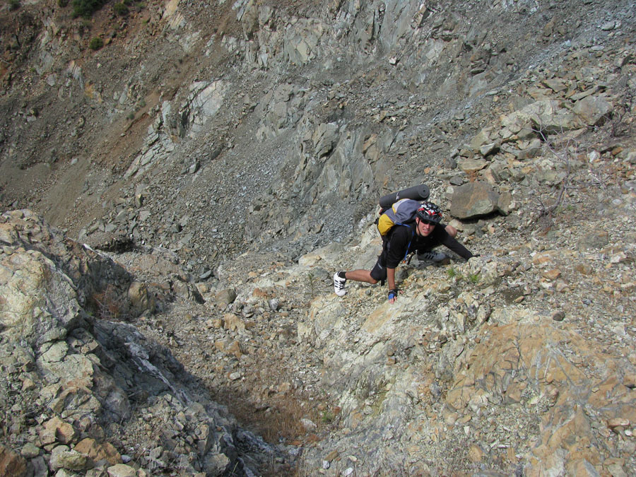. Иду самым последним, ибо, воды мало и иду медленно, чтобы меньше сжигать энергии. Нашел возможное место ночевки и выложил камнями указатель (если придется возвращаться ночью). Но вот появился Алексей, без велосипеда и обрадовал вестью о том, что чуть выше отличная поляна, где можно разбить лагерь.