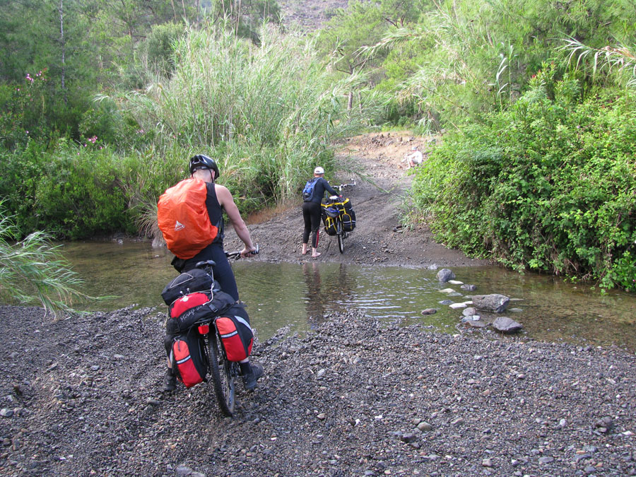 Вообщем после минутного обсуждения мы начинаем наш путь по фрагменту пешеходного маршрута Lycian Way. Иногда, когда в горку и много камней идем пешком, но обычно едем. Отличная дорога! не в том плане что хорошее покрытие, нет, но кругом сосны, внизу море, одна бухточка сменяет другую, по пути встречаем русскую женщину из отеля которая решила прогуляться, немца который идет по маршрутам Lycian Way уже 7 день, еще немецкую пару и двух турков туристов из Стамбула. Немец предупреждает нас что этот маршрут не везде такой хороший для велосипедистов, и после Olympos мы наврядли сможем перемещаться по нему с велосипедами вообще. По пути в бухтах из родников оборудованны источники воды – супер! Останавливаемся в самой большой бухте, тоже с источником, ужинаем. Только я залазию в палатку на небе грохочет молния такая что в палатке становится светло и тут же начинается тропический ливень. Вова не успевает буквально пару секунд для того чтобы остаться сухим