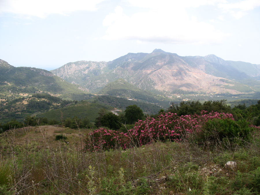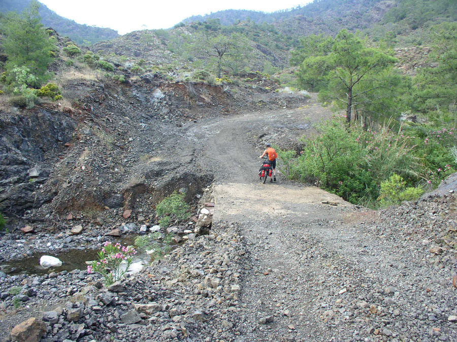 Двигаемся дальше – наша цель поселки Ciraly и Olympos, где согласно путиводителю отличные пляжи и есть древние руины. Уже видим пляжи Ciraly от которых нас отделяет только одна бухточка и холм, однако дорога заводит нас в тупик со склоном на который с великами не влезть. Но вроде есть дорога в сторону от моря – начинаем двигаться по ней. Никаких ответвлений нет, а дорога взбирается выше и выше. Да, маркеры Lycian Way больше не встречаются, пересекаем несколько речек-ручьев. Все выше и выше и выше – становится понятно что мы попадем куда то в другое место, предположительно снова на трассу D400. Мест для ночёвок нет – кругом обрывы и камни, но нам снова везет, и когда дорога достигает своей верхней точки где то на 500 м над уровнем моря Алексей оповещает нас о том что нашел чудесный луг, весь в цветах