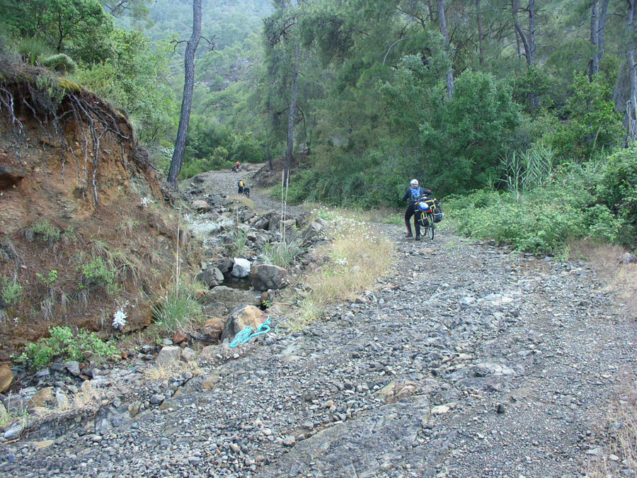 Seliff: Утром я встал в 6.00, сходил вниз по пешему маршруту, который ведет к морю. Местный говорил, что-то про 9 километров, прошел метров 300 и вернулся назад, так как понял, что с велами, груженными, мы не пройдем. Подняв остальных, приготовили крицу (4 окорочка сварил) 1 пожарили, собрались, поели и начали подниматься. Я пройдя немного, решил поднимать по отдельности вел и штаны. Что и было проделано, правда, мне получилось поднять только вел, а штаны помог поднять Алексей. В общем, вырвались опять на нормальную дорогу и решили ехать в Каш , более-менее крупный городок. Правда, по 400-ой не поехали, а поехали по второстепенной параллельно основное и в горы не надо было ползти. На самом деле второстепенная дорога оказалась с нехилыми перепадами высот и весь день, прокрутив педали и не доехав до Каша километров 15, свернули с дороги, и поговорив с местным пастухом Мустафой, поставили палатки. Покушали бутерброды, сил и воды готовить не было, и отбиваясь от местной фауны (жуки, пауки, двухвостки, огромные комары и т.д.) залегли спать, проехали в этот день 45 км., а по ощущениям, все 150.