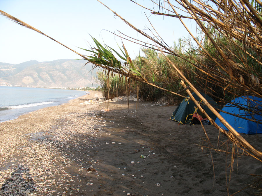 Объясняем, что всё нормально, выясняем, где кемпинг и шутками и прибаутками (как обычно) кушаем. Затем находим кемпинг, чуть выше. Начинаем выяснять стоимость за 2 палатки. Называют цену в 15 лир за палатку. Пытаемся торговаться, но видимо, не с тем человеком. Уходим, обсуждаем, что больше 20 лир не дадим и возвращаемся всеми. Находим настоящего смотрителя и пытаемся договориться за 20 лир, рассказываем, что мало денег, что еще долго ехать и все такое. Он проникся нашими рассказами, соглашается на 20, но просит дать паспорт. Пока я возился с паспортом, он вышел с калькулятором и набрал цифру 25, как назло мы засветили деньги и пришлось заплатить 25 лир, но 5 лир мы всё же отжали. Место оказалось очень классное, выбрали с видом на море, по инициативе Алексея обустроили стоянку столом (принесли с другого места). Сходили на разведку, нашли место, где можно нырять метров с 1,5, с подъемом на лестнице. Приняли горячий!!! душ, первый раз за всю поездку и пожрав, завалились дрыхнуть, договорившись на завтра зависнуть в этом кемпинге до 15.00.