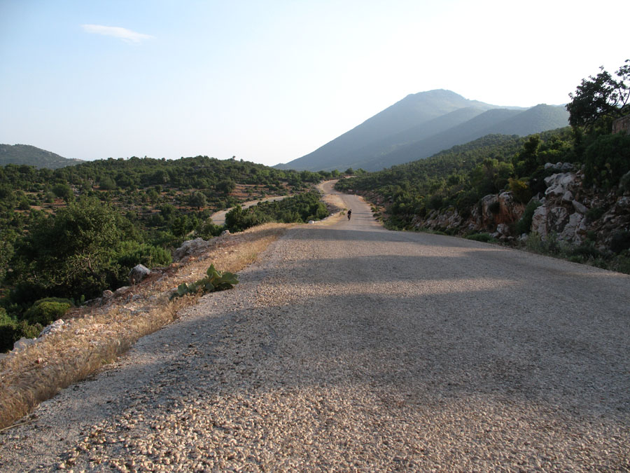 Покушав, не спеша выдвинулись дальше в горы. По карте мы должны выйти к городку Чирали. Длинная дорога в горах, подъем, на который заходим пешком, спуск, тоже зачастую пешком. Наконец, встречаем немца, который занимается Nordic Walk (с двумя палками) он говорит, что дальше спуск и бухта, и дорога заканчивается. Идем дальше. Маркеры, которые были на всем протяжении маршрута закончились (красно-белые полоски на камнях). Идем по дороге, ведущей в горы. В бухте обнаружили признаки рыболовного поселения, но как-то там было всё заброшено.