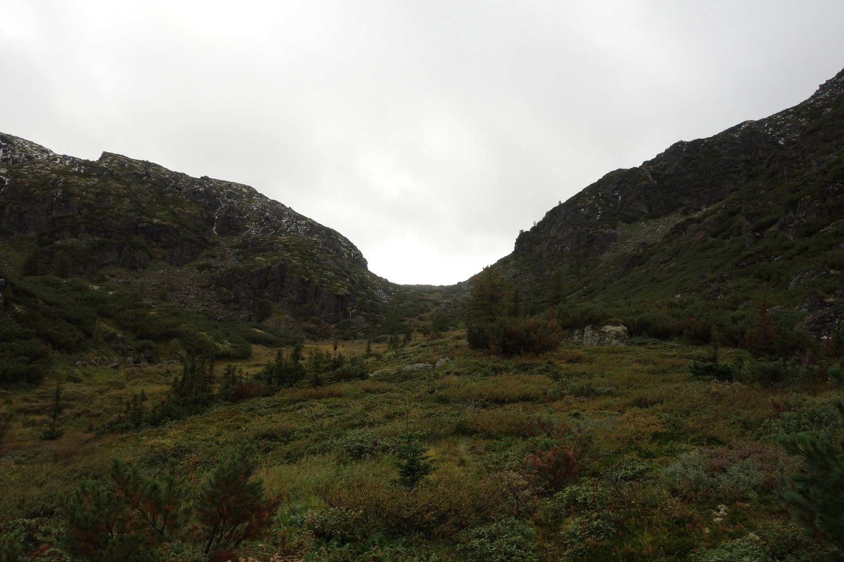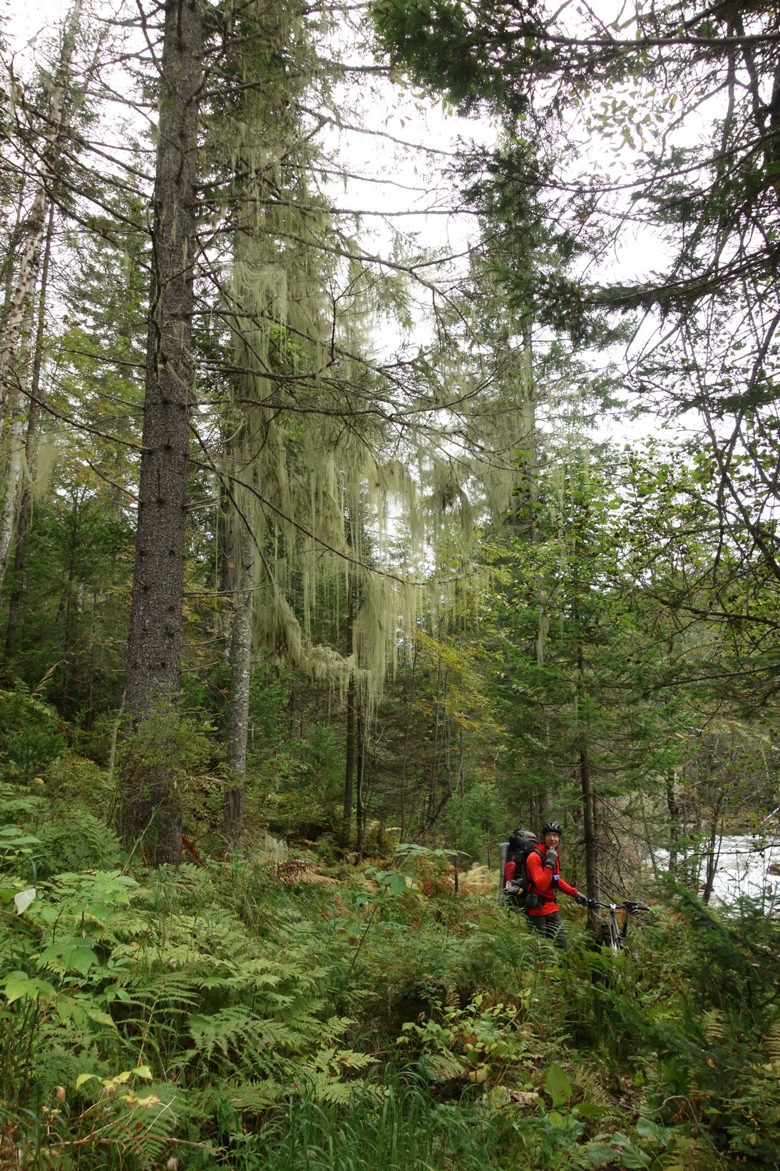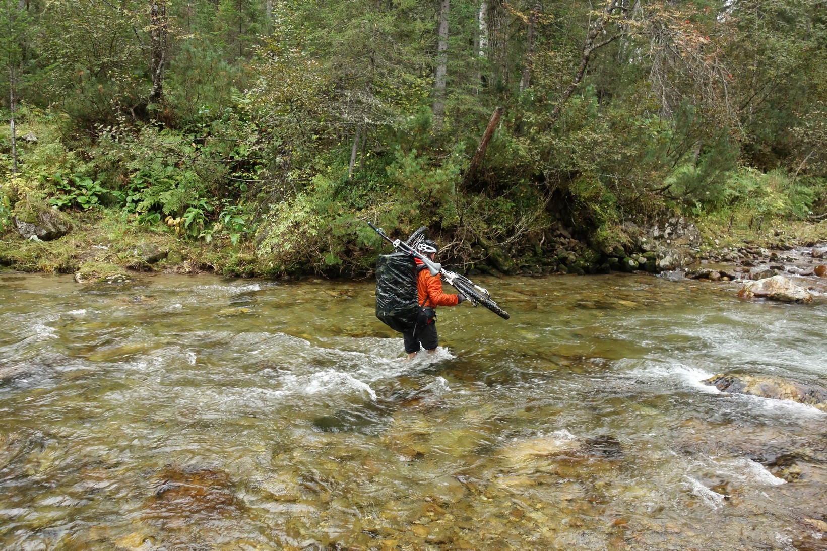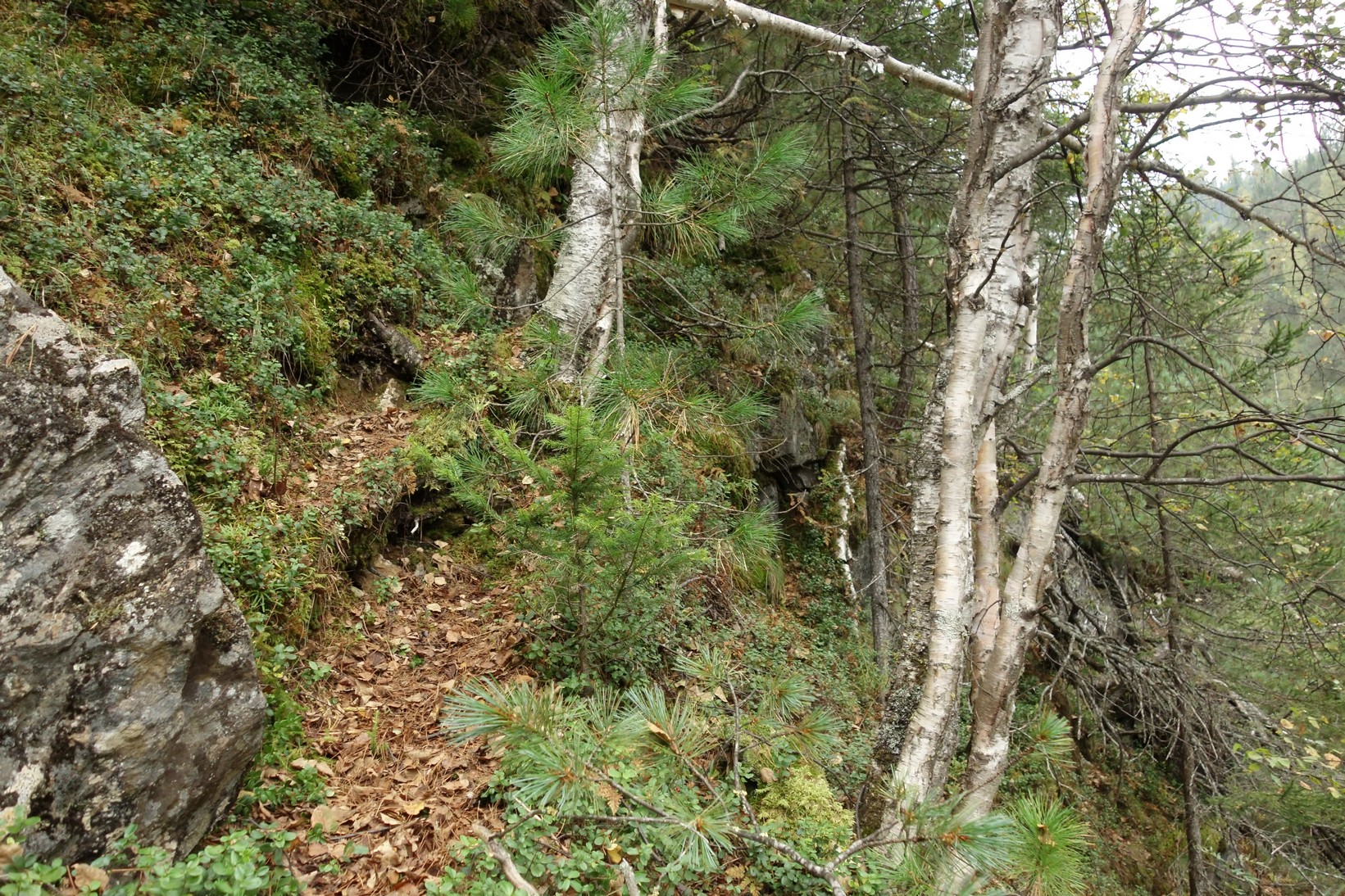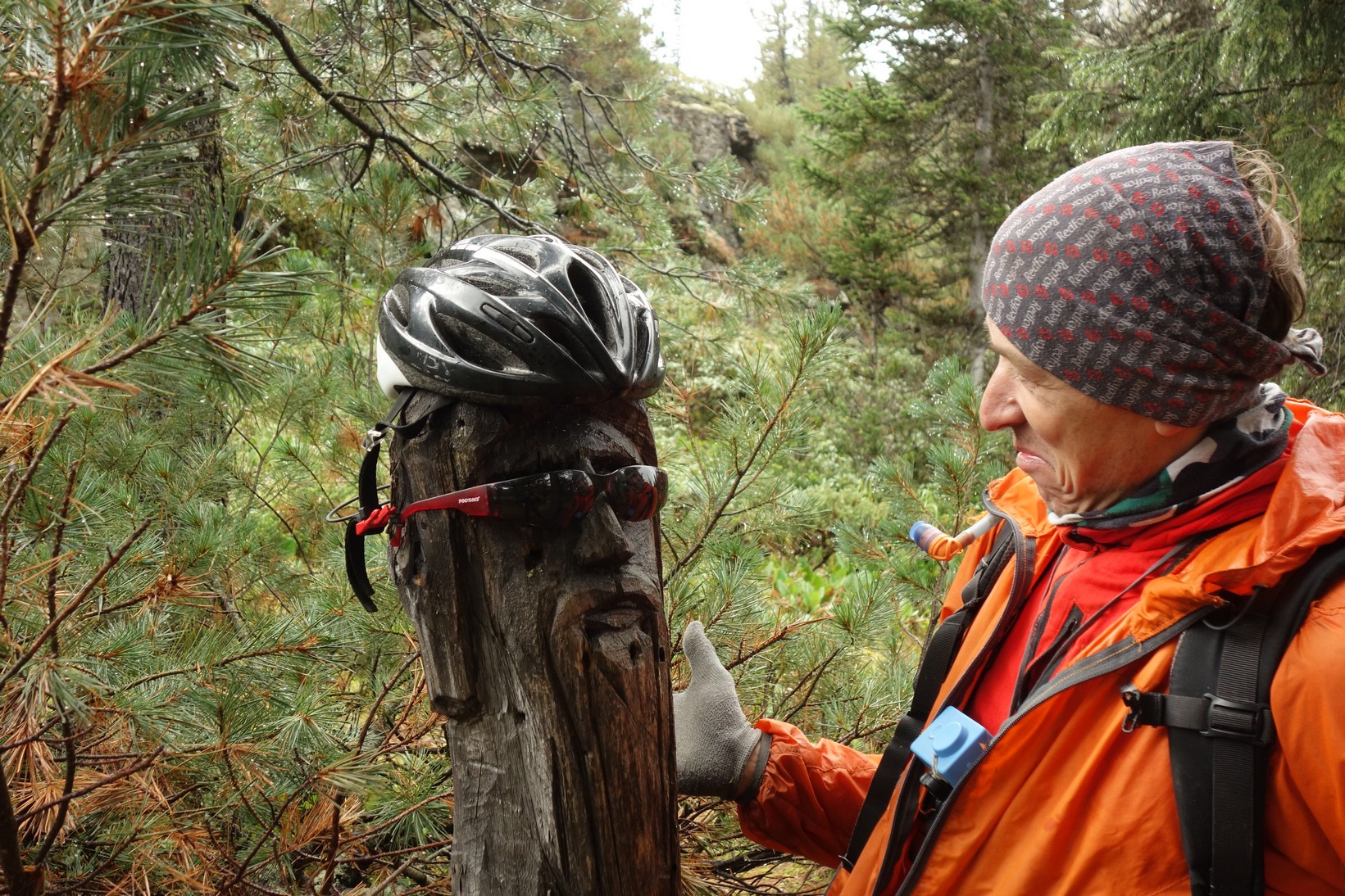Ну ладно-ладно, его нет в самом начале, по долине Лангутая, но лучше бы оно там было. Потому что долина Лангутая - это такие забайкальские джунгли. От Игумновского тракта, как я уже писал, не осталось толком ничего. Изредка получалось пройти по явной полке метров 20-30. В основном она либо смыта рекой, либо завалена камнепадами. А в остальном тропа - это слабый след, заросший низкорослой пихтой, обходы скальных стенок, на которых приходилось передавать друг другу велосипеды и 1 км/ч скорость движения, без преувеличений. В один из дней у нас было пройдено 14 км. По болотам мы доводили до 27 км за день!