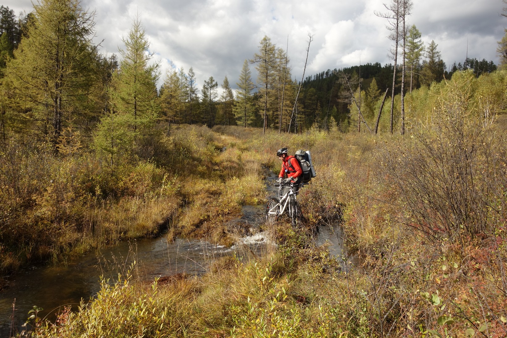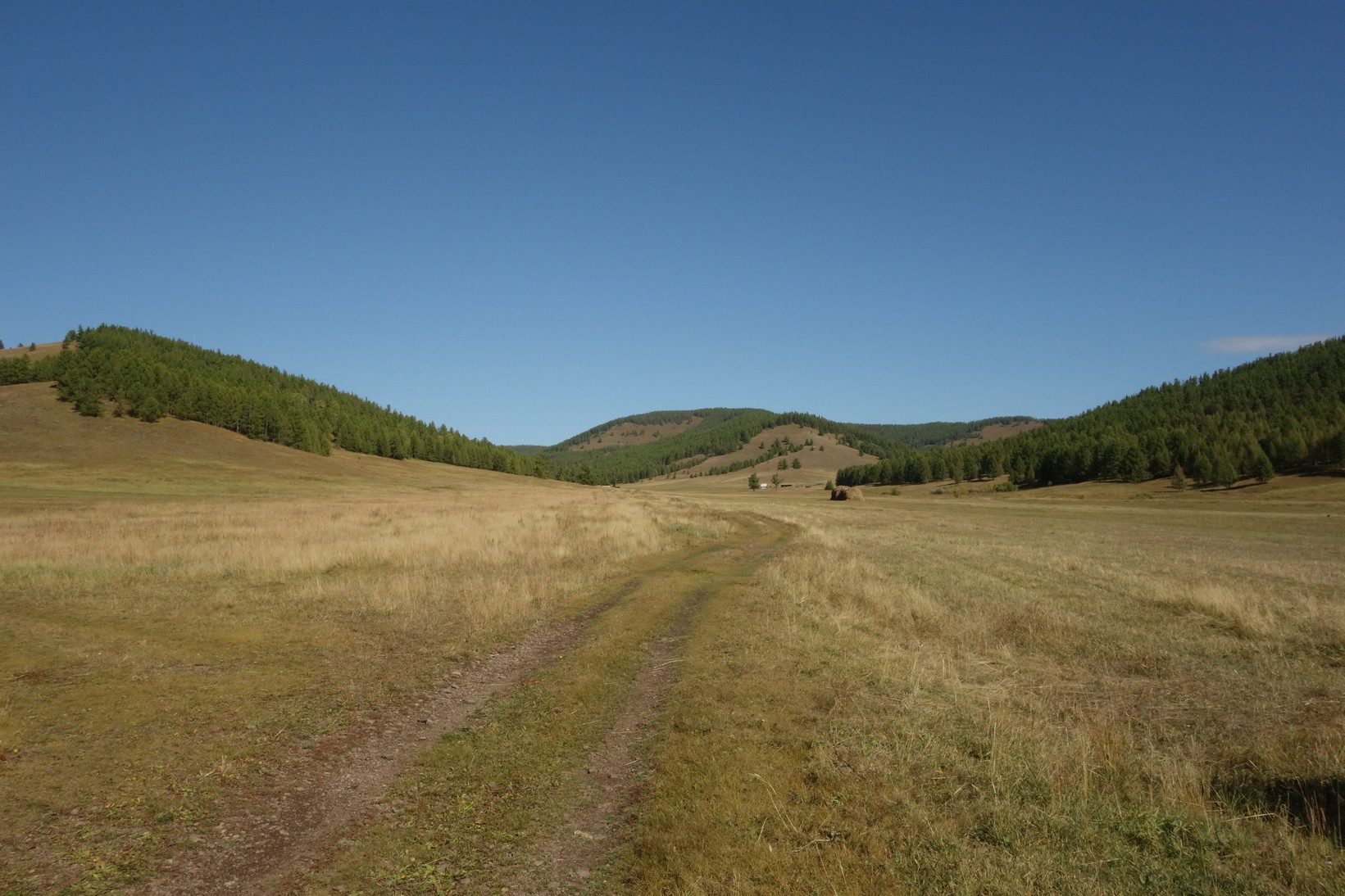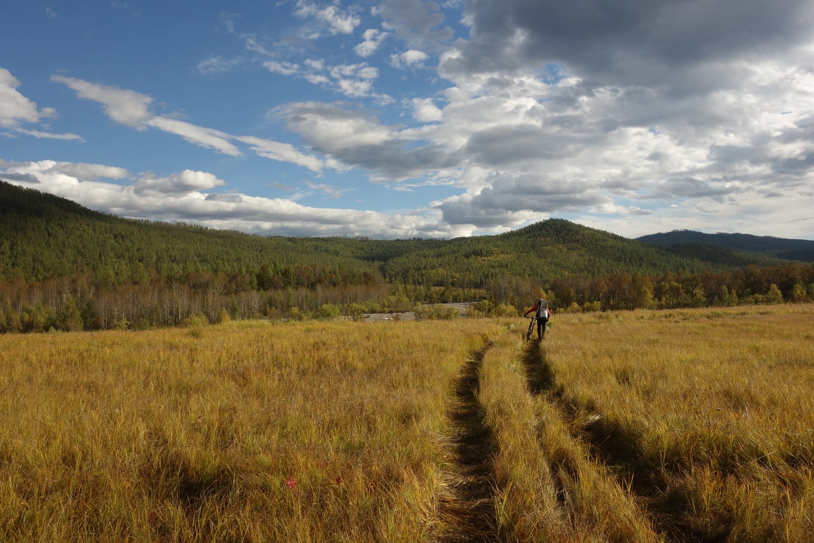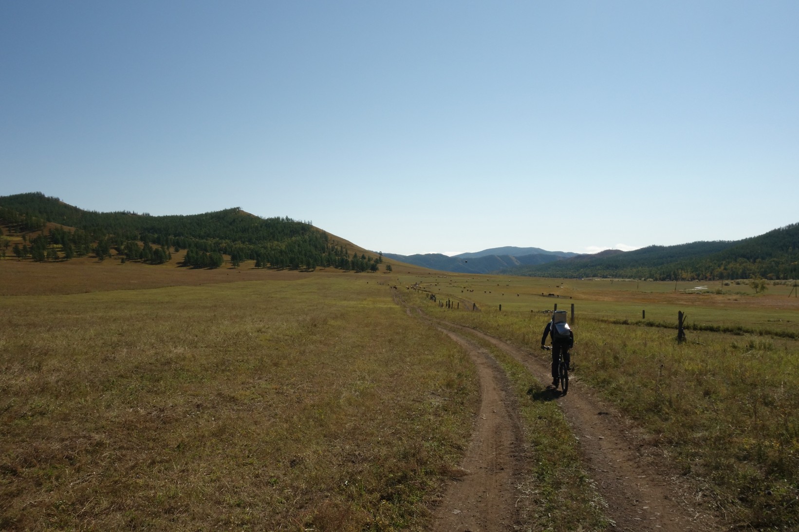 В общем, 6 дней мы шли пешком и тащили за собой велосипеды. Когда по щиколотку в воде, когда по колено. А закончилось всё довольно стремительно. На безымянном перевале через хребет Малый Хамар-Дабан, собственно, последнем значимом для нас перевале. И декорации сменили так внезапно, что я поначалу находился в околошоковом состоянии и с трудом воспринимал действительность. А действительность заключалась в дороге, бегущей вниз по долине через пастбищные луга и перелески. Иногда она забредала в сырые места, но зачастую там даже спешиваться не надо было, оно проезжалось или объезжалось. Ну и за оставшиеся 3-4 дня пути лисапеды полностью оправдали своё присутствие.