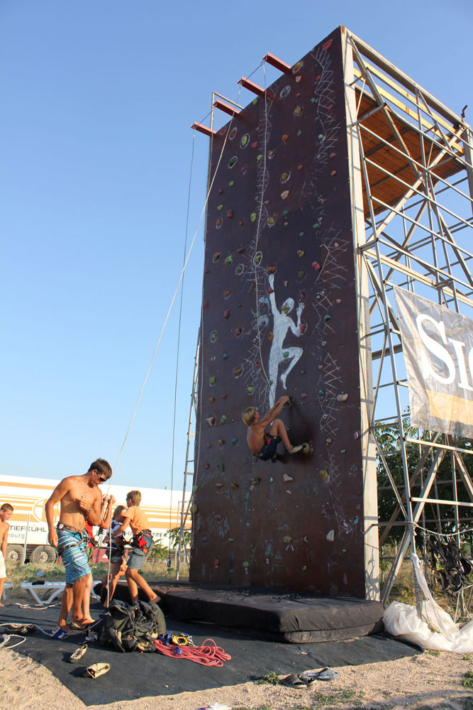 Идеальный вариант, которому мне не давали следовать – это просыпаться через час после начала завтрака, в это время в душе уже никого нет, после чего приходить на завтрак, где также уже свободно )) (хотя уже в 8 утра в палатке такое пекло что не хватает веника) кстати когда Женек проверил температуру - там было 57 градусов, а на припасенном газовом баллоне нашлась надпись "не нагревать свыше 45 градусов", но это не страшно, рядом с нами (у камеры хранения) валялся чей-то 5 литровый баллон ) (ну да ладно никому неинтересны эти коммунальные передряги) воду кстати иногда отключали )))) Честно говоря, за неделю до начала ZGames, казалось, что строители не успеют ничего сделать, хотя потом оказалось, что ZGames проходит немного не на тех сооружениях, где Kazantip, и к играм в основные площадки таки развернулись… Даже такой простой, с виду, снаряд как хождение по канату – технологичен, специальная стропа которая выдерживает большой вес (разной ширины, для разной сложности) специальная распорка которая забивается в землю и механизм натяжения, кстати интересное занятие, дойти до середины и не упасть – уже подвиг, а некоторые ходят туда, обратно, и даже прыгают, делают перевороты сальто и др...