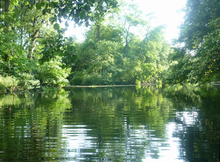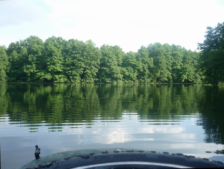 с трудом уселся cо второй попытки. Снаачало уронил в воду рюкзак и привязанное к нему переднее колесо. Все потому, что у жировских озер практически нигде нет плавного спуска в воду (пожалуй на Жирово только одно место). А так шаг- и сразу полтора метра глубины. Все же стартовал. Кременчуг после Погоново - самое большое озеро. Посередине оно изламывается и влево уходит заросшая протока в Солдатское озеро.
