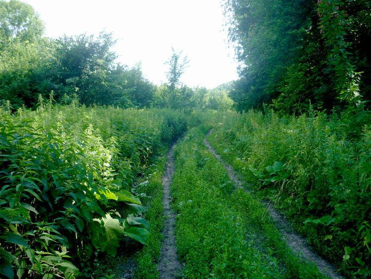 Моя лодочка продолжает службу. Последний раз мы под ней прятались от дождя на Динамо во время 2- го этапа КК. Но судно просит волны. Вот я и поехал в одиночное путешествие на Жировские озера. Туда ехал через плотину и горелый лес, потом вдоль озера Жирово. Колея там неезжена. Видны следы диких усилий какого то транспортного средства проехать после дождя. Зато крапива уже в человеческий рост.