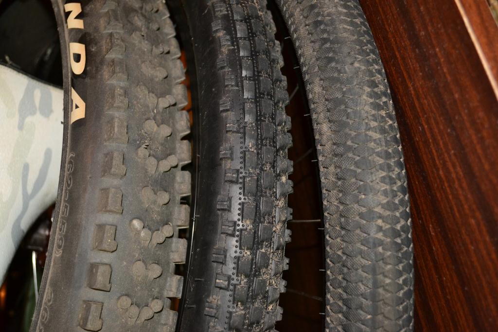 Соответственно слева-направо На шинах, боковых порезов и прочей нечисти нет, 1 прокол был на кинипшене от стекла - 2 мм размер отверстия)) Эль моко цепляется за грунт как бешеная, ларсен и кинипшен очень накатистые...