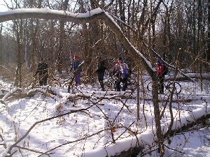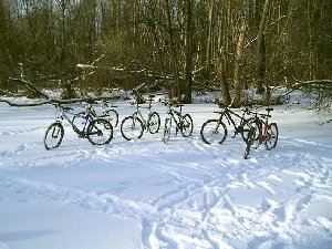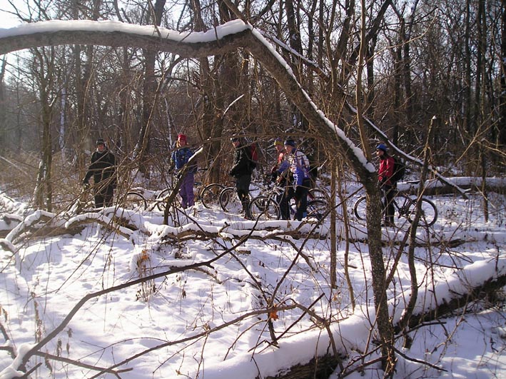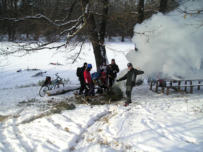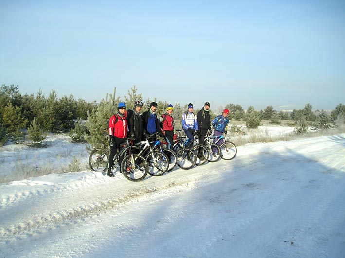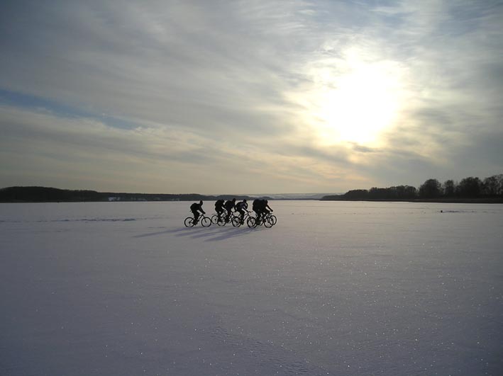 Сегодняшнее месиво, несмотря на вроде бы небольшой километраж, нагрузило всех по полной. Асфальта было километров семь. Остальное - различные комбинации снега, льда и песка. Не побоялись мороза сегодня аж восемь человек. 460, , Андрей, Inokoff, Radler, San, Wowanbezbash, Zheny и я, который даже не опоздал. Профи были без шипов. На то они и профи. Поехали через Песчаный Лог, аэродром и сады на бетонку и к плотине. Уже в Песчаном Логу началось месиво там где тропинки были неровно утоптаны нашими двуногими предками. Снег, укатанный машинами, после этого воспринимался как асфальт. В Песчаном Логу я понял, что далеко не уеду - руки дико мерзли. Спас Zheny у которого были запасные перчатки. Надел их под свои и увидел, что это хорошо. После плотины лесом свернули на оз.Жирово http://www.velo36.ru/forum/download/fil ... d=5522&t=1, на лед которого трепетно ступили первый раз в этом сезоне. Лед был равномерно присыпан снегом. Снега было сантиметров пять и ехалось комфортно. В лесу, кстати, из за отсутствия солнца было заметно холоднее. На оз. Жирово мы только заехали, а дальше поехали по на редкость раздолбаной колее к Сонькиному озеру. Многие спешно убавили давление в колесах и увидели, что это хорошо. На этом участке я ехал последним. Все уехали вперед, только 460 ковырялся в веле. Я подъехал и оказалось, что ОН СЛОМАЛ ПОДСЕДЕЛ. Не крепежную гайку, а именно карбоново - алюминиевую композитную трубу в том месте, где она торчит из рамы. НЕ ПОКУПАЙТЕ ПОДСЕДЕЛОВ RACE FACE тех, которые Carbon Wrapped. То ли они не держат минуса, то ли сама идея обернуть тонкую алюминиевую трубу карбоном ущербна. От подседела отломали кусок сантиметров в 10, остальное загнали обратно http://www.velo36.ru/forum/download/fil ... d=5525&t=1. Поехали. На Сонькином озере провели фотосессию http://www.velo36.ru/forum/download/fil ... d=5523&t=1, проехали в его конец и буреломом http://www.velo36.ru/forum/download/fil ... d=5524&t=1 прошли метров 100 до оз. Солдатского, где у берега оборудован столик для отдыха всяких вояк (как и на Жирово). Долго пытались развести костер с помощью волшебных спичек Вованабезбаш. Дым валил жуткий, а огня было мало http://www.velo36.ru/forum/download/fil ... d=5526&t=1. Наведались наверх, на высокий берег, а там огромный стол построен и целая поленница дров припасена. Часть этих дров спустили вниз и вскоре костер пылал. Устроили чайинг и сосисинг, а также сушинг и отжиминг, потому как все были мокрые от непосильного отдыха. Дальше по льду Солдатского и через ольховые заросли доехали до оз. Кременчуг, где мы шарили летом на байде с Радлером и Семеном. По льду Кременчуга, повторяя байдарочный маршрут, заехали на оз. Икосное, а потом на Мыльное. Оттуда лесом поехали на Погоново http://www.velo36.ru/forum/download/fil ... d=5528&t=1, поражающее своими размерами. Переехали Погоново на западный берег и лугами, по следам машин вернулись на Жирово, а оттуда в Березовку. Ехать через Масловку или через плотину по асфальту не хотелось. Поехали лесом до Таврово, а в Таврово встали на лед водохранилища и, поигрывая очком, поехали на правый берег. То и дело лед лопался с пушечным звуком. Ехать было гораздо хуже, чем по Жировским озерам. В лунках рыбаков было видно, что толщина льда уже сантиметров 20, правда, встречавшиеся участки, похожие на замерзшие полыньи, энтузиазма не добавляли. Снег  был какой то плотный и приходилось вовсю вкручивать. Добрались до правого берега и поехали по льду вдоль него. После того как пару раз заехали в выступавшую из под снега в