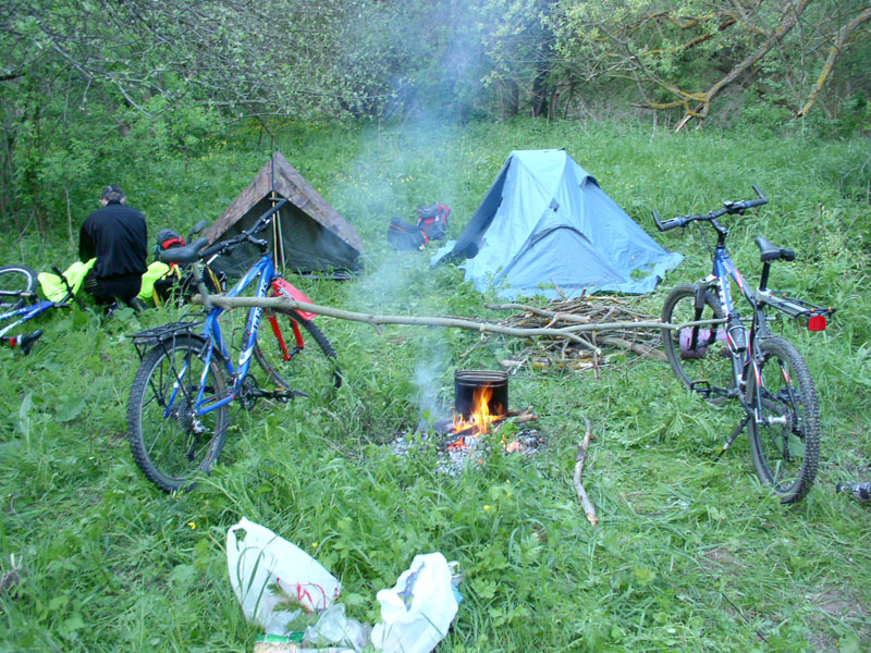 Наконец после полу часа поиска идельного места оно наконец найденно -- прям возле реки с тропинкой к воде, и через 5 минут после того как мы разбросали вещи -- с местным селянином на каком то драндулете. Селянин оказывается доброжелательным мужиком, рассказывает о жизне в их округе и желает нам хорошо провести время. Вспоминая фотку найденную на ВелоКиеве применяю велики в качестве рогатин для костра :)