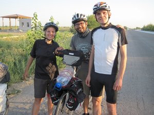 Двигаться из Самарканда в Бухару нам помогал сильный попутный ветер, и мы выразили сочувствие мексиканцу и немке, которых мы встретили вблизи Бухары, так как ехали они нам на встречу. Но за год путешествия (стартовали в Германии), думаю у них были разные ветра, да еще и будут, так как через Киргизию они направлялись в Китай, Вьетнам, затем Австралия, Южная Америка. Скромные, приветливые, улыбчивые ребята. Расписались у них на велорюкзаке. Немец из Восточного Берлина, встреченный вблизи Обигарма, запомнился хорошим русским ( неудивительно, после того как он перечислил районы России где он ездил на велосипеде), велосипедом за 70 долларов, купленном на монгольском рынке (5000 км уже прошел) (Сережа говорит: «Обязательно расскажу московским друзьям, что на велосипеде за такие деньги можно проехать такое расстояние»), размером штатива для фотоаппарата и интересным способом перевозки запасного багажника. Он метеоролог и вынужден полгода работать, а остальное время катается. Еще был австриец, направлявшийся из Самарканда в Алма-Ату. Россиян не встречали. Сережа - человек науки, проводил в походе одновременно три эксперимента. Первый: сон на свежем воздухе. Хотя, залезть в два спальника, упаковаться в велочехол и потом утверждать: "Люблю спать под звездами." Но держался стойко, сделал два исключения за весь поход. Причины: плохое самочувствие и сильный ветер, а во второй раз потекли ручьи. Второй: забыл дома кружку и пил из пластиковой треснувшей самолетной, упорствовал, пока не подогнали ему хорошую пластиковую баночку с крышкой, освободившуюся от меда. Но зато третий эксперимент завершился его полной победой: Швальбе Марафон плюс тур с защитой Смарт Гарт не проколется. Такая покрышка стояла у него на заднем колесе, переднюю в расчет не берем: с жесткой вилкой Сережа тестировал варианты балонного велосипеда, по ширине покрышка была почти как у меня на "Яве" (он даже специальную запасную камеру вез). Хотя у Андрея, даже более дорогие, Швальбе Марафон Экстрим, тоже с хорошей антипрокольной защитой, за несколько оборотов колес имели 9 проколов, колючки мелкие, искать сложно. Я экспериментов не ставил, а снимал велорюкзак на обочине дороги и нес велосипед на руках, но проколов не избежал. Антипрокольную ленту выкинул на третий день похода. В Закарпатье все было хорошо, колеса не спускали. А тут внутри колес черный резиновый порошок и потертости на покрышке и камере, может температура гораздо выше.