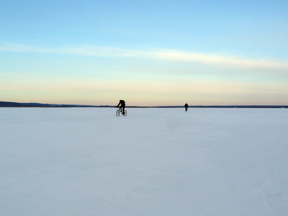 Я сегодня проехался по водохранилищу... Подозреваю, что старица реки Воронеж нынче аналогичная. Ехать можно только по ветру, против ветра можно только катить велосипед - мешает как ветер, так и снег, непонятно откуда взявшийся (позавчера его не было). Про ледок забудьте (во всяком случае на Водохранилище). Он есть только локально, основная часть водоема покрыта слежавшимся снегом, но главное - ВЕТЕР. Впервые за зиму у меня замерзли руки, и пришлось одеть перчатки потеплей. Термостельки актуальны, как и бахилы поверх ботинок Обморозить лицо можно только так, посему ехать лучше в маске поверх балаклавы. В принципе под углом к ветру тоже можно ехать. После водохранилища едется в лесу просто замечательно.