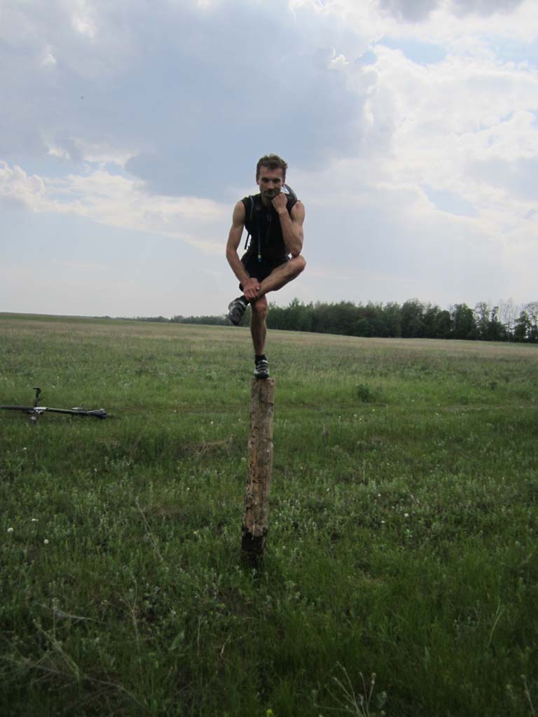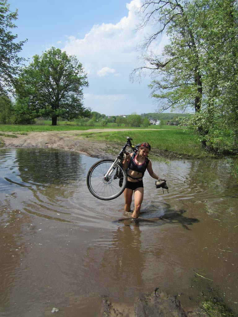 Как выяснилось ближе к концу сегодняшней, все-таки 150 километровой поездки, главной задачей Гали и Вовы сегодня было пережечь весь гликоген в мышцах, чтобы заменить его на более высокооктановый. Зачем? - спросите у них. Основным итогом для меня явилось развенчание мифа о круглом озере. Его там нет. Есть круглая и довольно сухая заросль тростника и все. Зачеркните его на картах и забудьте. Сейчас скажу по порядку как было. Было у Олимпика четверо : Галя, Вова, Иван и я. Вдарили по педалям и устремились ко 2-му посту ГАИ оттуда шмыгнули в дачи и лесом в СтЖвТинное. Глядь! А тут и Айдарово недалеко. Тесна Земля - матушка! Рамонь объезжали вовсе не аствальдтами, а накатанной грунтовкой через красивую ендову в полях. По запаху вышли на Лопатки. Они украшены с краю свинарником. Пронзили Лопатки умелыми движениями тренированных тел и начали затяжной спуск в пойму к Бондаревке. Сразу по завершении спуска дорога занырнула под воду. Строения Бондаревки нелепо топорщились из реки Воронеж, величаво разлившейся и не думавшей входить в берега. Иван посмотрел и по каким-то идеологическим мотивам повернул обратно и в воду не полез. А мы полезли. Перешли вброд один перелив, потом другой. Вода нагрелась на солнце и была почти горячей. Нашли на берегу Воронежа не залитый бугорок, сели и стали думать. До противоположного берега было метров 150. Мой первоначальный план - переправляться на лодке поодиночке и возвращать ее обратно с помощью веревки отпадал. Веревки было только 50 метров.Посмотрели мы с Вовой друг на друга, обнялись как братья да так вдвоем в лодку и сели. Сели да и поплыли. Приплыли. Оставил я Вову сторожить другой берег, а сам вернулся за велами. Перевез сначала два, потом еще один. Тут уж Вова в лодку сел и поплыл за Галей. Ее тоже перевез. Жалко ведь бросать такую красоту! По уже сложившейся традиции оказалось так, что высадились мы на остров, со всех сторон окруженный водой. Правда валить деревья или надувать опять лодку для переправы не пришлось.Перешли водные преграды вброд и оказались на большой земле в соснах. Включил я навигатор и по приборам мы устремились искать круглое озеро. Искали пока не уперлись в сухие болотные кочки, которые по навигатору и были тем самым озером. Оказалось, что мы не одни такие изыскатели. Около нас несколько раз проехал трехосный ЗИЛ, потом остановился. Оттуда вылез парень и спросил не знаем ли мы где тут круглое озеро. Я с некоторым злорадством ткнул пальцем в кочку. Парень расстроился, ЗИЛ уехал. А мы отправились галсами в сторону заповедника. Природа в тех местах безлюдная и странная. Некоторые поля возделаны, некоторые нет. Посреди полей тут и там высятся острова из деревьев и кустарников. Подвернулось озеро, на этот раз с водой. Разглядев вдали лес, к нему и направились. На севере громоздились тучи и погромыхивало. У леса, как и положено раскинулись по пескам Пчельники. Дорога лежала к Чистому озеру через весь заповедник. Комаров в заповеднике мы застали врасплох. Однако все поголовье комаров было быстро мобилизовано и мы бежали сломя голову. Чистое озеро пока еще с водой. В нем сидит масса народа. Когда мы сделали привал на его берегу начало громыхать уже с востока. Решили в Графскую не заезжать, а ехать лесом по прямой куданьть в Тресвятское. Не вышло. Задолбали пески. Спасаясь от них ушли сильно вправо за высоковол