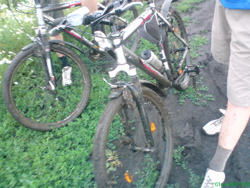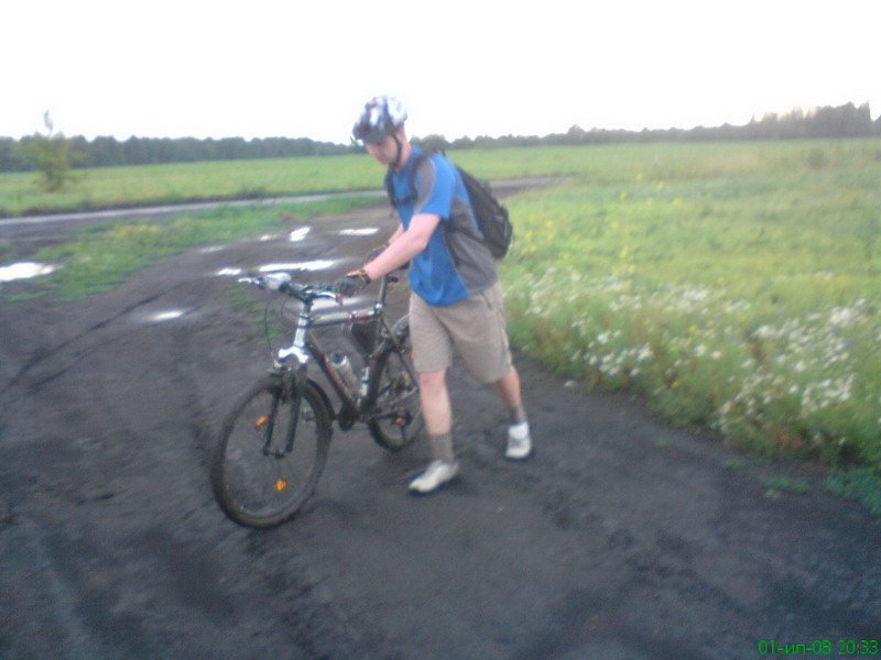 Впереди ехал berserk. Я замыкающим, поэтому мог наблюдать Э Т О во всей красе. См. фото1. Заканчиваеться асфальт, начинаеться мокрая черноземная грунтовка через поле. Санек съезжает с асфальта, проезжает 10-15 метров и так аккуратненько, с характерным звуком "шлеп", падает на бочок. В панике сзади него расскрывает объятья земле-матушке и Ваня. Я удержался. О-о-о-о! Как я радовался ! Я мерзко хихикал и предлагал им идти пешком и везти велосипеды рядом. Ведь земля, набившись под крылья, полностью лишала их возможности ехать по грунту! А подклинивавшее переднее колесо уничтожило и такое понятие, как "управляемость вела". Один-в-один как на льду.