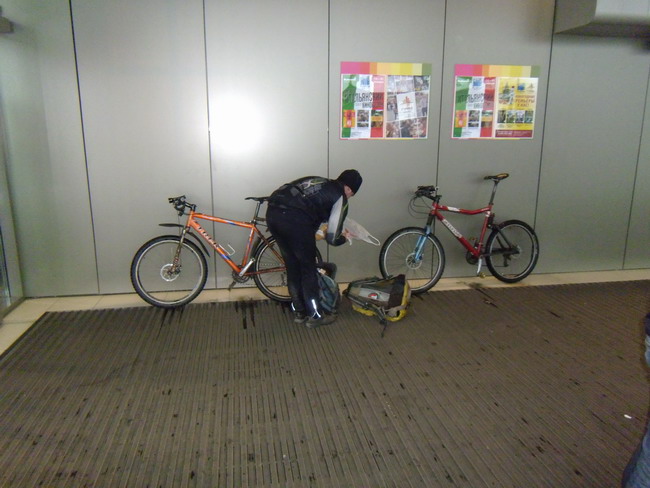 Зимняя программа потихоньку выполняется. Сегодняшнее путешествие осложнялось для меня необходимостью долго ехать на шипованном двухподвесе по чвякающей жижей обочине федеральной трассы М4. Я недооценил погоду и действие реагентов, которыми щедро сдабривают аствальдты. Поленился прикрутить крыло. Вот почему, к моменту поворота с М4 на Сенное в Комсомольском,спину уже залило. Успокаивало наличие провизии, которой мы с ВованомББ обзавелись, завернув в Град.