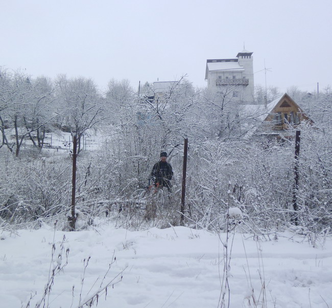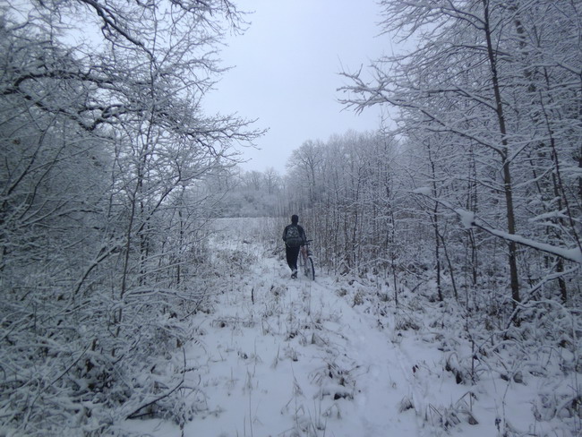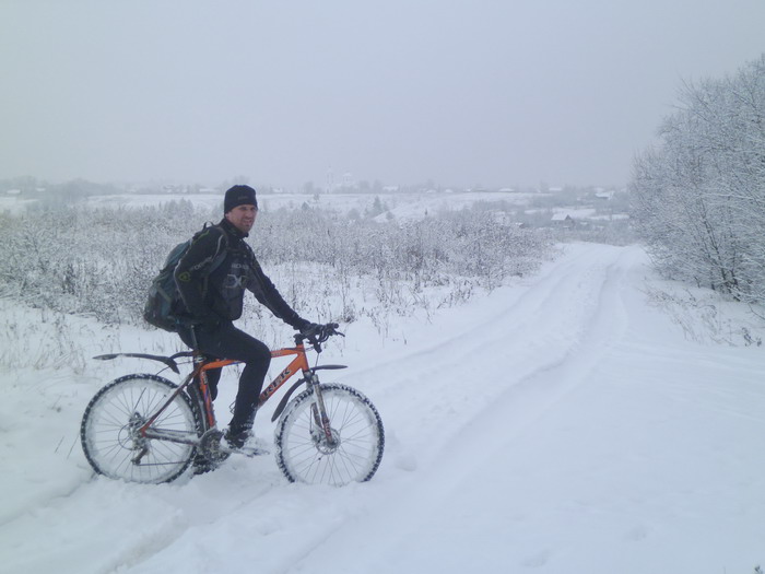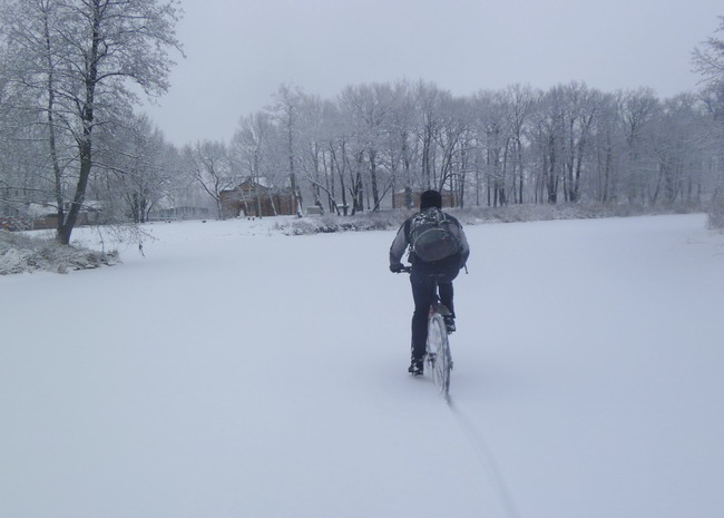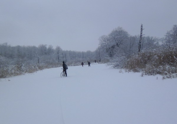 Ехать было можно - снега упало еще не очень много. По дороге встретили пьяную пешую троицу и рассказали им, что есть такое развлечение - кататься на велосипеде где попало. Вскоре вышли к Излегоще и, встав на ее лед, были атакованы вопросом еще двух встречных.