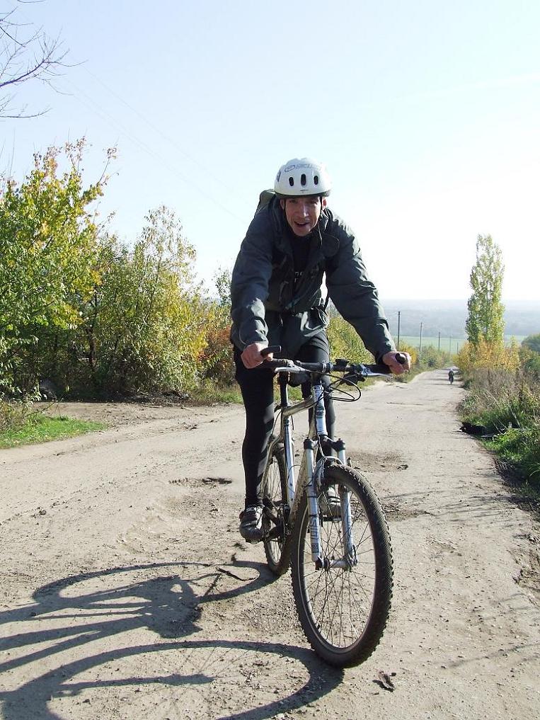 Вот мы и приехали, надеюсь все. Alexander M по причине заболевшего колена не смог поддерживать темп группы и между Хохлом и р.Еманча нас отпустил вперед. А покатушка началась с запозданием из-за меня. По всей квартире искал мобилу, пока не вспомнил, что забыл ее в гараже вчера. С чуством вины, напялив как было уговорено, шлем подъехал к цирку и обнаружил, что в шлеме один лишь Konalex. Остальные: 460, Alexander M, Ivana и Radler, щеголяли непокрытыми головами или издевательски украсили их матерчатыми кепочками. Покатушка оказалась под угрозой срыва. Впрочем, светило солнышко и мне в шлеме становилось жарковато. Поэтому решено было ехать. Маршрут был сразу изменен. Планировалось из Шилова ехать в Хохол, а поехали по курской трассе до моста, свернули в Подпольное, преодолели первый разминочный тягун на дачах перед Орловкой и вот уже перед нами овраг за которым раскинулась областная психбольница. По склону оврага сначала пвтались спускаться на велах, но когда Ivana улетел через руль в кусты, энтузиазм пропал, дальше спускались пешком да и поднимались тоже. Radler попробовал заехать, но забуксовал на месте. Ущемленное байкерское самолюбие решено было залечить в психбольничном магазине, где накупили шоколада, воды и тут же все это съели – выпили. Памятник расстрелянным фашистами больным настраивал на философский лад. А дальше по полям подъехали мы к карьерам, где по глиняной куче пришлось спуститься на дорогу для БЕЛАЗОВ. Тут Radler проколол колесо, остановились чиниться. В это время , в качестве сюрприза городским гостям, работниками карьера был организован неподалеку взрыв динамита. Шутка удалась. Все так и подпрыгнули. Пока не рвануло второй раз, двинули по спуску к реке Девица. Отличный спуск, по которому ездят БЕЛАЗЫ, укатан до каменного состояния и скорость в конце подбиралась к 50. Перелетели р.Девица по мосту, когда забирались на другой берег рвануло еще раз. Выехали на асфальт,ведущий вдоль реки к Стрелице и Бахчееву. Брюжжание некоторых эстетов, что нафиг мол асфальт, с негодованием отвергаю. Во – первых: асфальтом его можно назвать условно, потому что он сильно выщерблен, а поверх наляпаны плямбы чернозема. Во вторых: дорога все время петляет, то поднимается, то спускается и ехать нескучно. В третьих: асфальт кончился довольно быстро и началась грязь не хуже чем в Костенках. Потом грязь сменилась настоящей, мощеной камнем дорогой, проходящей по деревенской улице. По-моему это уже был Хохольский. В конце-концов мы выехали на площадь к автовокзалу, украшенную скульптурой какой то местной богини и старинным трактором на постаменте. У трактора и на тракторе состоялась фотосессия. От площади уходила дорога на мост через Девицу к острогожской трассе. Преодолевая ветер в лицо начали мы покорять многокилометровый затяжной подъем. В конце подъема Alexander M от нас и отделился. После нескольких километров ровного участка, начался затяжной спуск к р.Еманча, причем из – за встречного ветра велы скорость не набирали. Вдобавок обнаружил у себя на заднем колесе восьмерку, такую, что ви - брейки пришлось расстегнуть. От р.Еманча к острогожской трассе идет подъем в гору, по уклону и протяженности очень точно расчитанный, чтобы вымотать попавшего на него байкера. Вообще, 15 – ти километровый участок шоссе от Хохольского до острогожской трассы сильно на любителя вкрутить высунув 