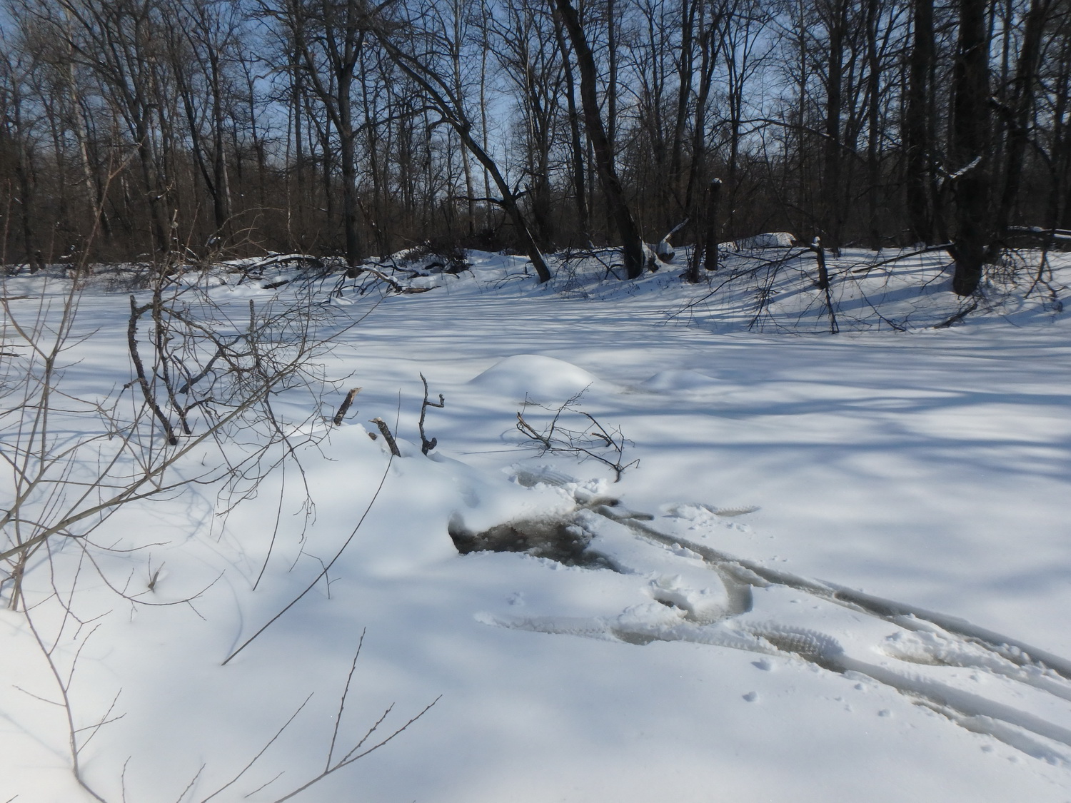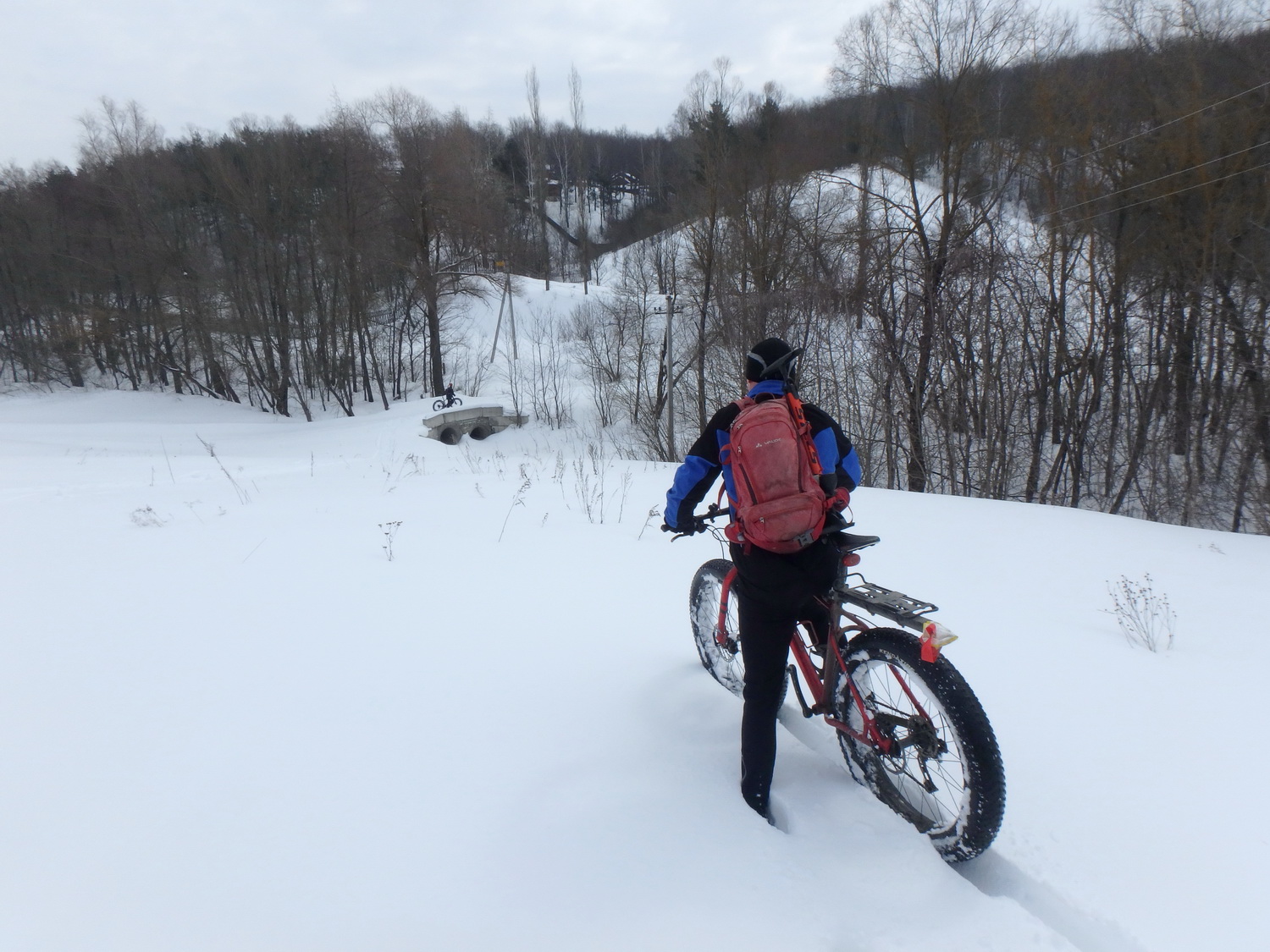 История склонна повторяться в виде фарса. В субботу это подтвердилось еще раз. А начиналось вроде бы хорошо, когда нам удалось погрузить на машину 3 фатбайка и один 27+ запихнуть внутрь. Доехали до Сенного, купив в Комсомольском сосисок. У сенновских дач разгрузились и пересели на двухколесных коней. Вскоре стало понятно, что фатбайк – не панацея от русской зимы. Если по дачам еще как – то ехалось, там где прошел бульдозер, то на спуске в сенновскую ложбину, даже под уклон не получалось. Река Воронеж оказалась замерзшей повсеместно, хотя из под снега выступала вода, и, там где летом быстроина, снег был буроватый. Участок незамерзшей воды, всего несколько метров, виднелся при впадении в Воронеж Излегощи, у ее верхнего устья Двинулись на другой берег Воронежа по рыбацким следам. Пара рыбаков сидела у второго устья Излегощи. Там все как бы замерзло, и мы перебрались в прибрежный лес. Глубина снега в лесу и отсутствие утоптанных дорог и тропинок исключали всякую возможность продвижения по лесу в седле. А хотелось, как минимум попасть на Черное озеро – излегощенский плес. Можно было попробовать двигаться по замерзшему рукаву Излегощи. Пошел я с велосипедом из леса на лед, чтобы исследовать такую возможность. Прямо у берега лед мягко, без всякого треска ушел из под ног и я оказался в холодных водах притока Воронежа, скажем так – почти по пояс. Посторилась история двухлетней давности. Я ведь уже проваливался в Излегощу тогда – на течении и по грудь. Тогда там было глубины метра 2. В этот раз история повторилась в виде фарса, течения не было и дно ногами нащупал.