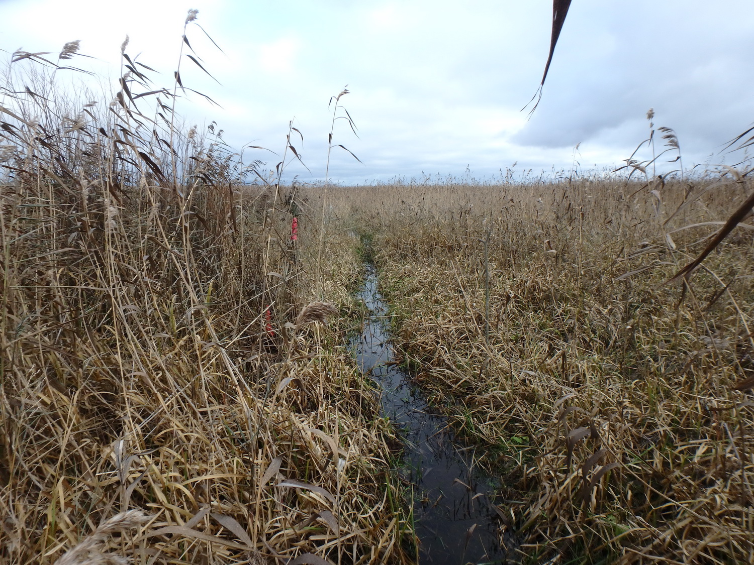 По навигатору вот вот должна была начаться водная гладь. Предвкушая встречу с голубой ширью, я бросил велосипед и пошел ей навстречу налегке. Промочив ноги, плюнул и пошел прямо по канаве, зачерпывая воду ботинками Lake. По OSM карте я уже давно болтался в синих водах РВХ. За очередным поворотом тропы открылся вид на широкую мокрую жижу среди бескрайних тростников.