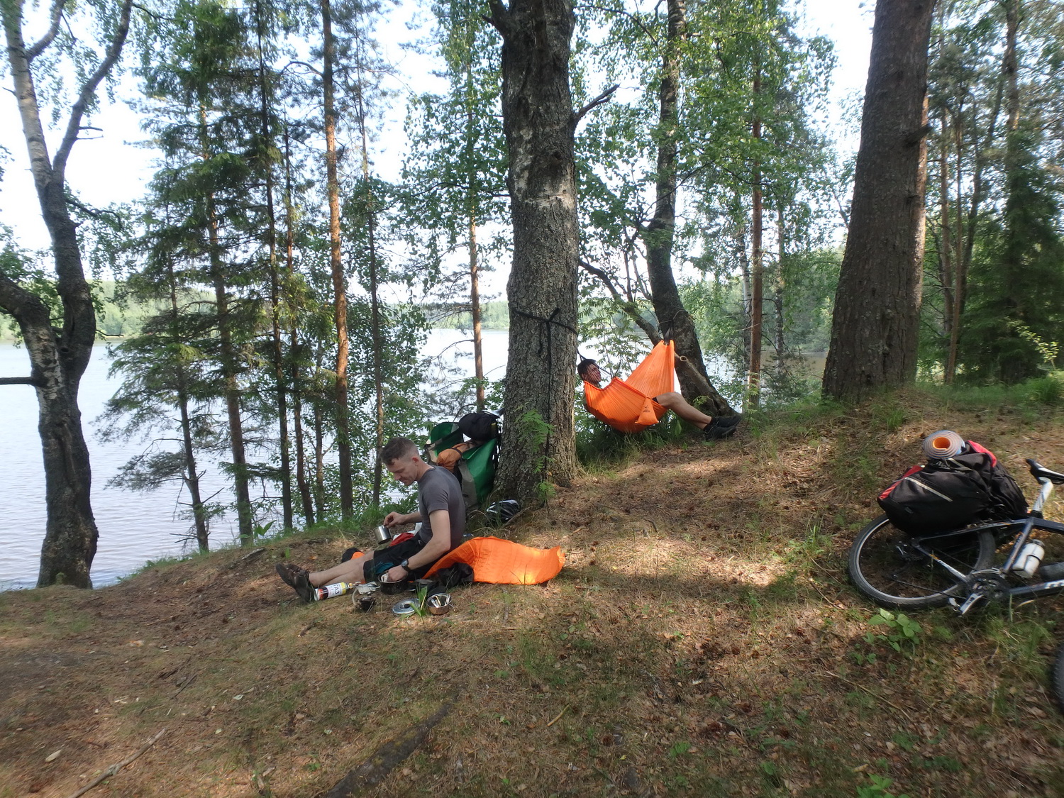 В Чамерово опять начался аствальдт. По плану в деревне Суково предстояла срезка через болотистый лес , чтобы не делать крюк по аствальдту до Весьегонска. Проехали по срезке метров пятьсот, и стало понятно, что не все дороги, нарисованные на ОСМ, таковыми являются. Людей мало, ездить по дорогам некому и они зарастают до состояния «лужок» или «рощица».В деревне Иваново выехали на трассу Весьегонск – Тверь. В ивановском магазине, где мы лакомились мороженым, произошла встреча с местным ясновидцем. Он сразу признал в нас с Пурпом геологов, впрочем, быстро повысил нас до ботаников. Олега он ошарашил сообщением, что невеста у него черноволосая и за ней нужен глаз да глаз. Под бременем этих новых знаний мы посеменили по шоссе на Весьегонск. Город Весьегонск в нынешнем виде – это уродливая дыра, выросшая на берегу разлившейся после постройки водяного рыбинского хранилища реки Мологи. Старые купеческие кварталы оказались под водой. Город живет рыбным браконьерством и обслуживанием москвичей и питерцев, которые повадились отдыхать в окрестностях. Гоповатые жители слоняются по пыльным улицам и скучают. Местный трэш венчает сгоревшее здание МЧС . Ночевали в сосновом лесу выше Весьегонска на Мологе. Местность немного напоминала плавни у нашей Белой горы. Ночью подул ветер и немного покапал дождь. Стало прохладнее. Договориться о переправе через Мологу не удалось. Утром по шоссе Весьегонск – Тверь двинулись прочь от Рыб. вдхрнлщ. по запасному маршруту в сторону города Красный Холм.