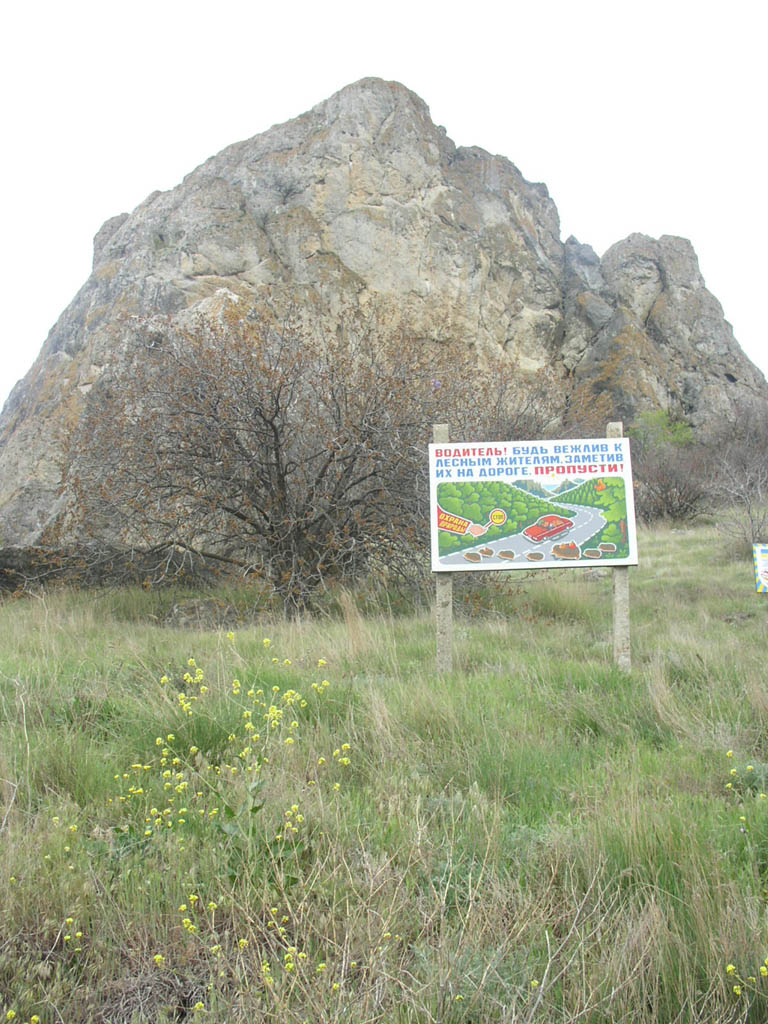 Поселок Курортное встретил нас все такой же пасмурной погодой и какимито замусоренными пляжами. Плакат у дороги призывал уступить дорогу ежам: :)